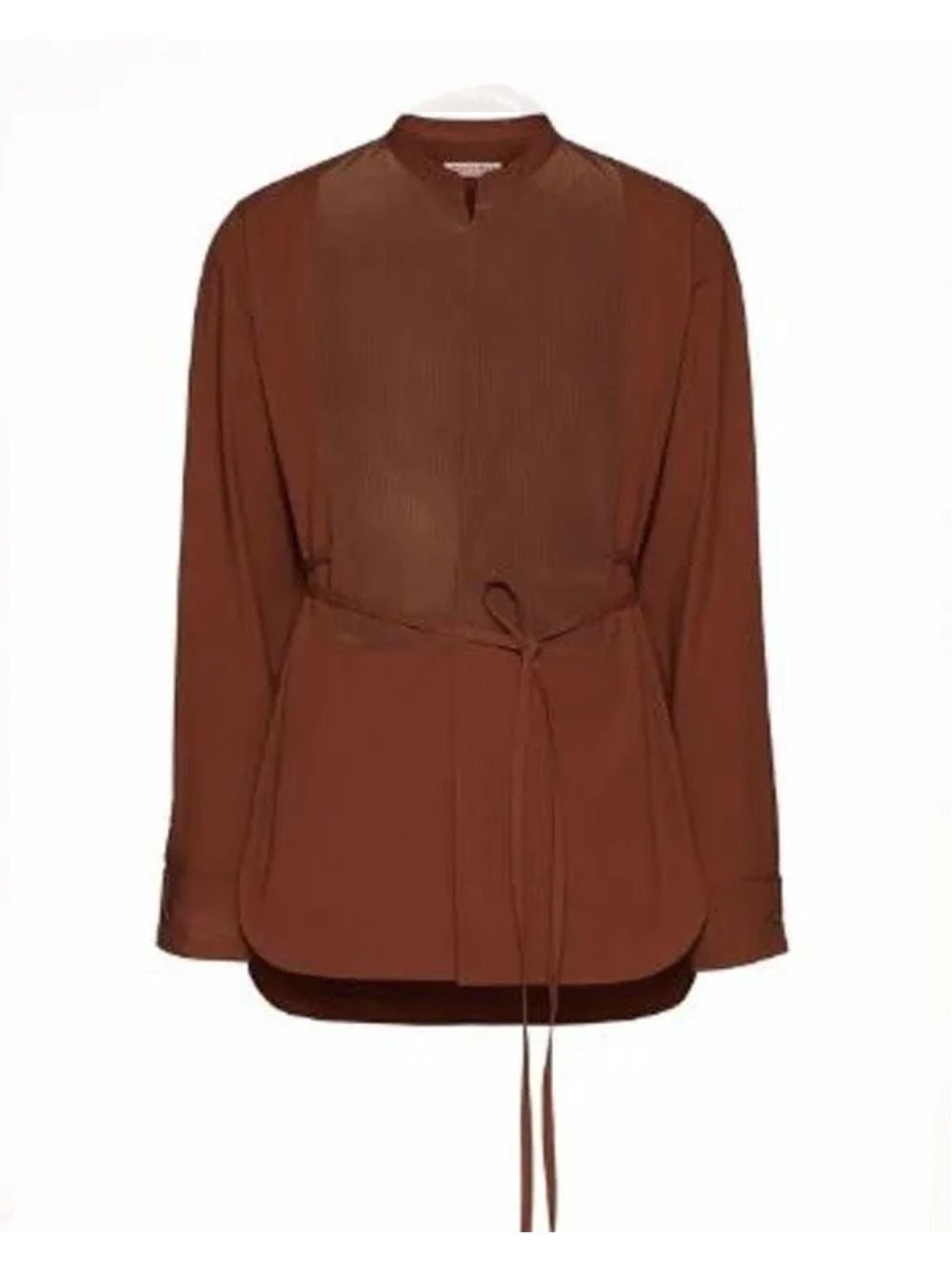The wrap belt front closure enhances the overall design by adding structure and adjustable comfort, allowing for a flattering fit. Finished in a rich brown color, this top pairs effortlessly with jeans, trousers, or skirts, making it a versatile addition to your collection.
