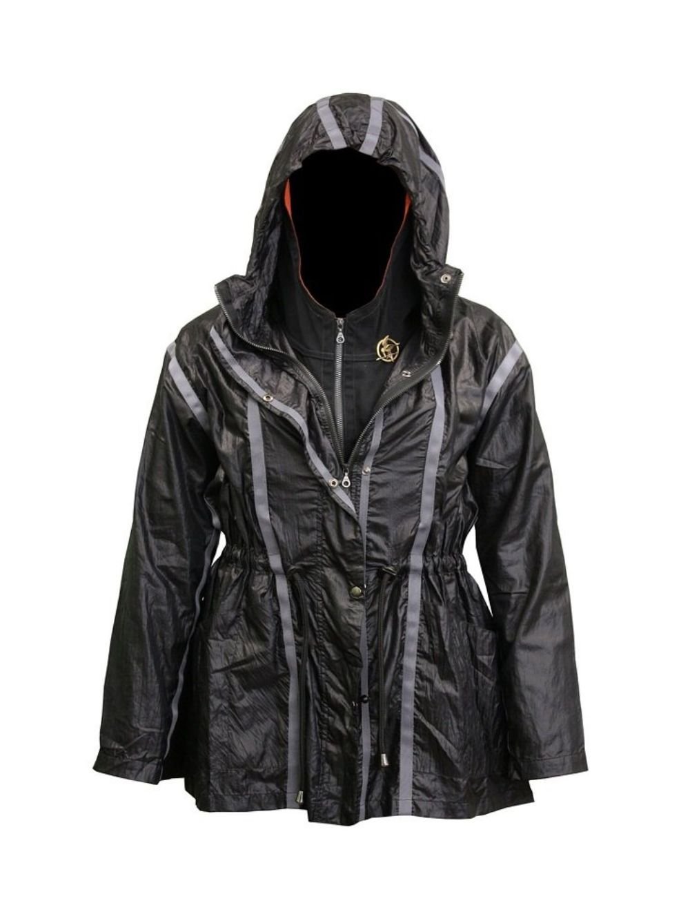 The hooded collar adds a distinctive and functional touch, offering extra coverage while staying true to the movie inspired design. Full length sleeves provide complete protection during cooler weather. The front zipper closure supported with buttons ensures a secure fit and adds a layered detail that enhances the overall structure of the jacket.