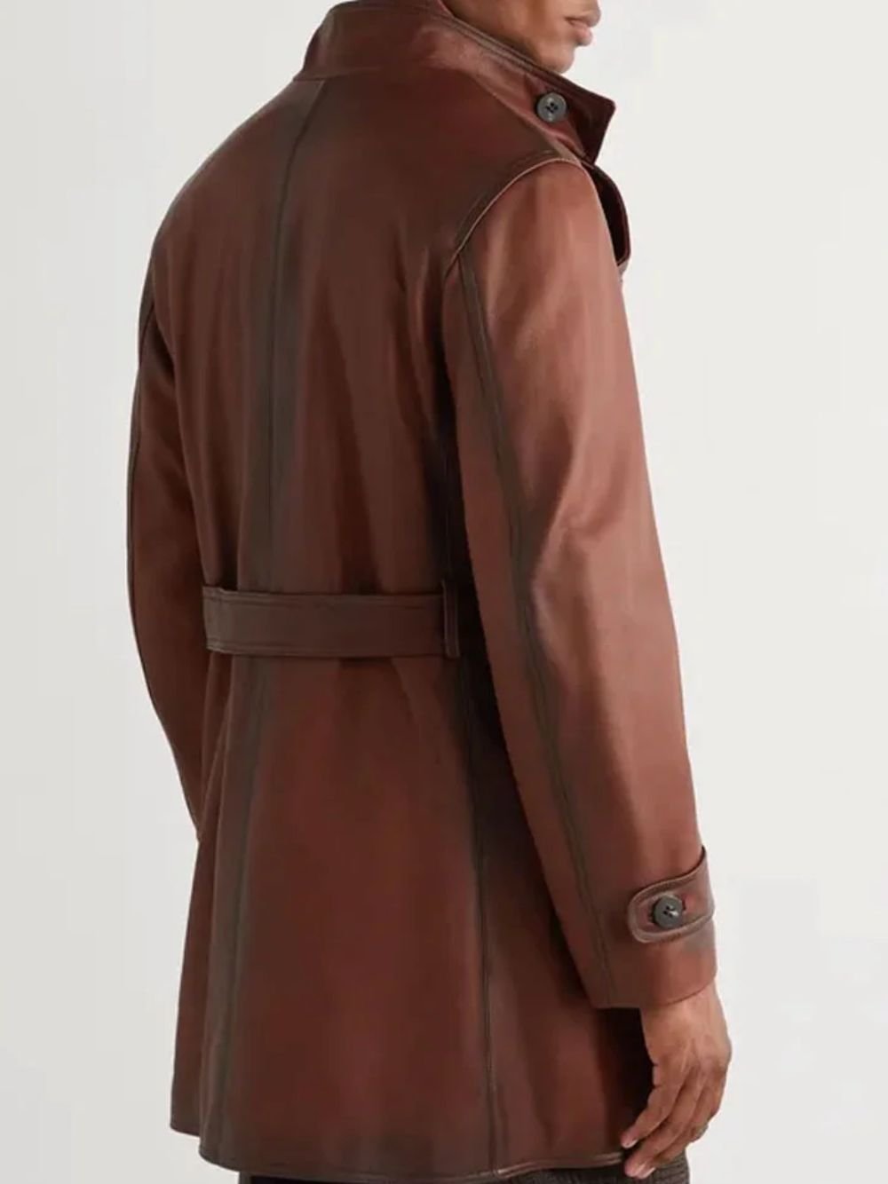 Made from genuine leather, this coat by Movie Jackets Hub features a rich brown finish that enhances its sophisticated and luxurious appeal. The leather exterior is durable and smooth, offering long lasting wear, while the inner viscose lining provides comfort and breathability for everyday use. This balance of style and comfort makes the coat suitable for extended wear in cooler weather.