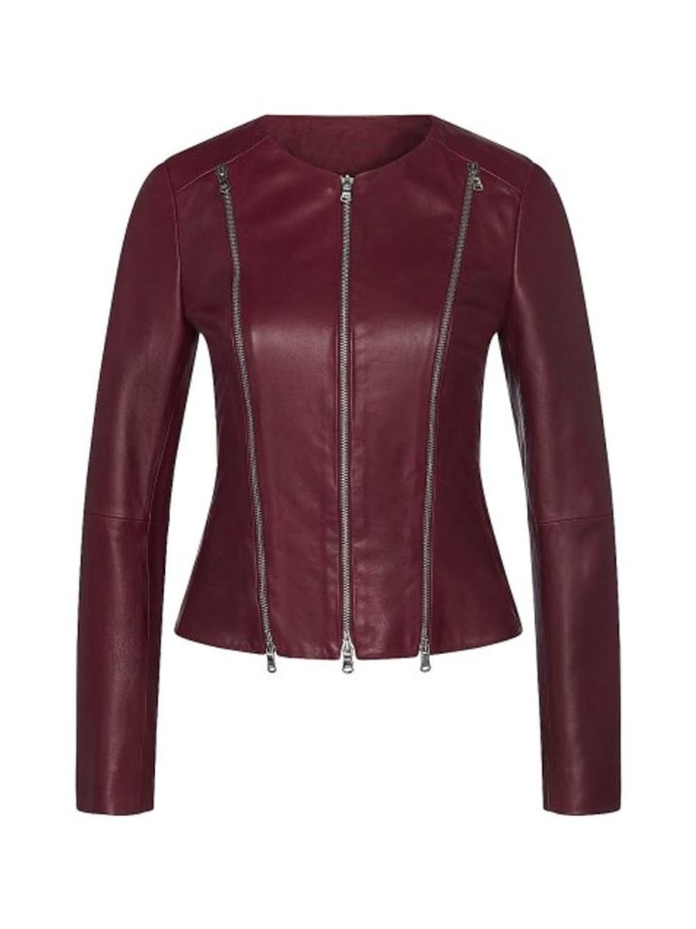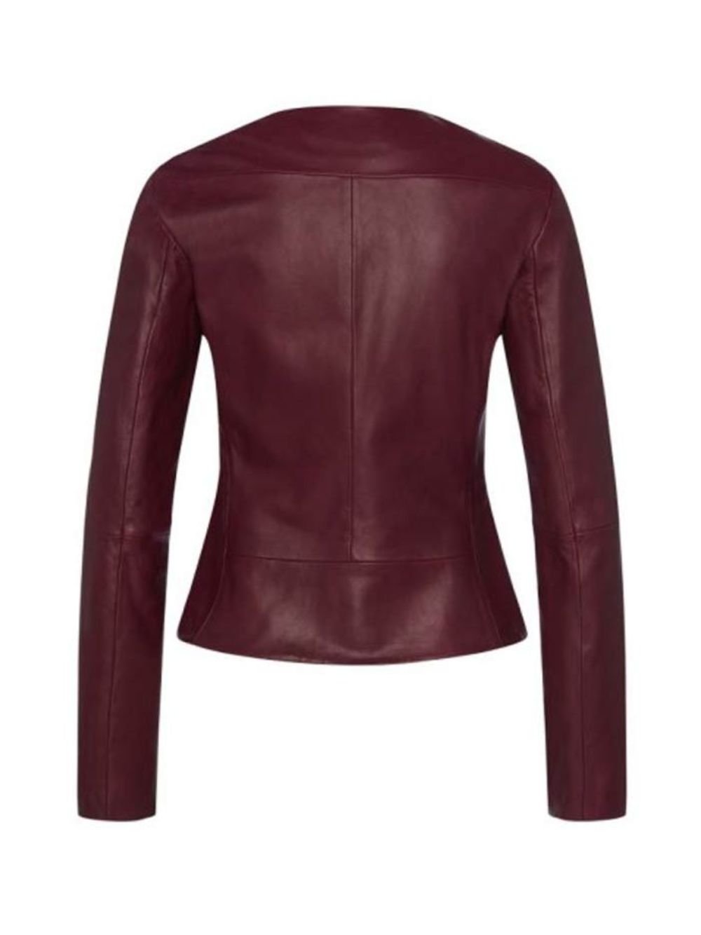 The round neckline style collar keeps the design sleek and modern, adding a subtle edge without overpowering the overall look. Full length sleeves offer complete coverage, while the fitted waistline hem creates a flattering shape that complements feminine styling. Finished in a striking maroon color, this jacket adds depth and uniqueness to any outfit.