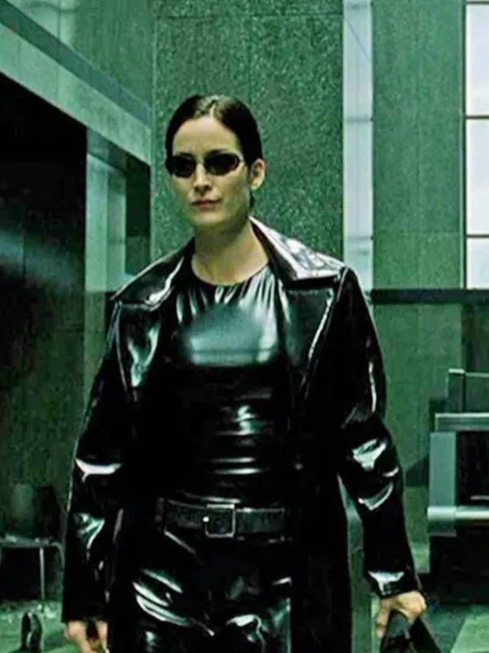 Carrie Anne Moss 2021 Movie The Matrix 4 Trinity Lapel Style Shining Black Leather Trench Coat