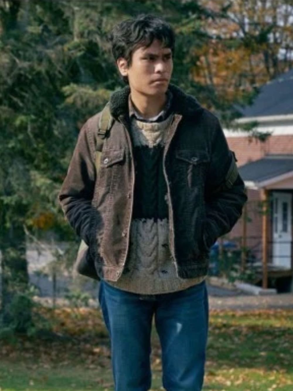 This brown trucker jacket tells a story of practicality and quiet confidence. Tyler’s style is never forced. It feels lived in, dependable, and real. The classic trucker silhouette paired with a warm shearling collar gives this jacket a rugged yet approachable look, making it perfect for everyday wear in cooler weather.