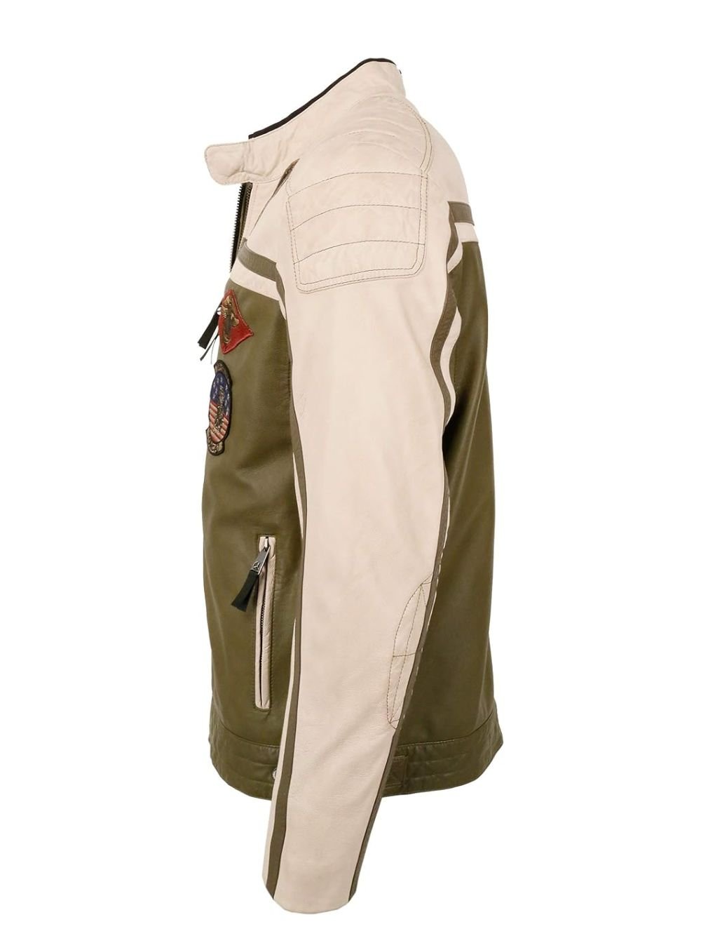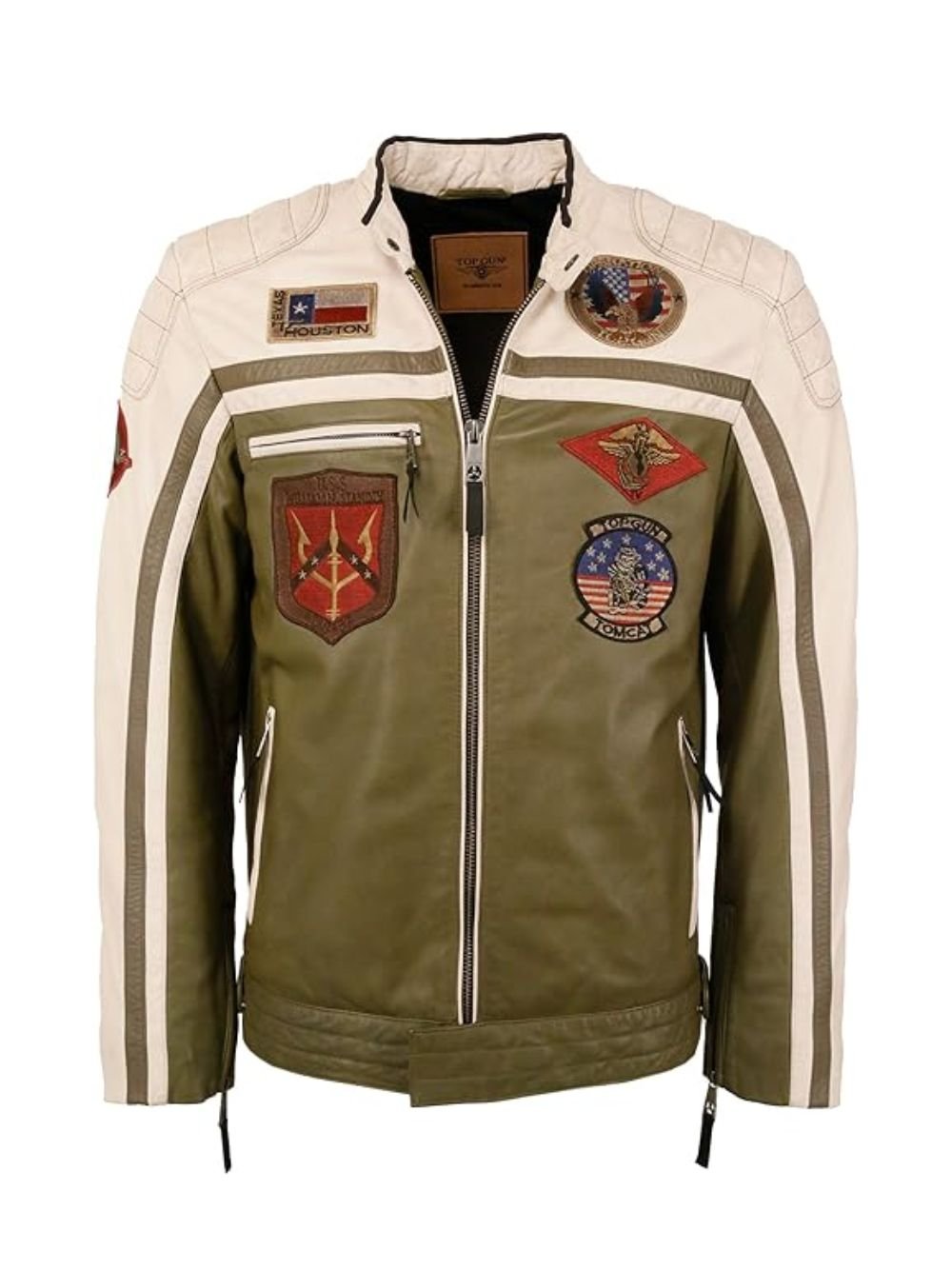 There are some distinguishing characteristics of the Top Gun Biker Olive Green and Off White Cafe Racer Leather Jacket With Patches. It is constructed of real leather. It has cuffs and a YKK zipper fastening. Additionally, Top Gun Olive Green Biker Cafe Racer Leather Jacket has an erect style collar and long sleeves. It is more enticing because of its Olive Green and Off White hues. This jacket is a must-have for bikers and all lovers of Top Gun.