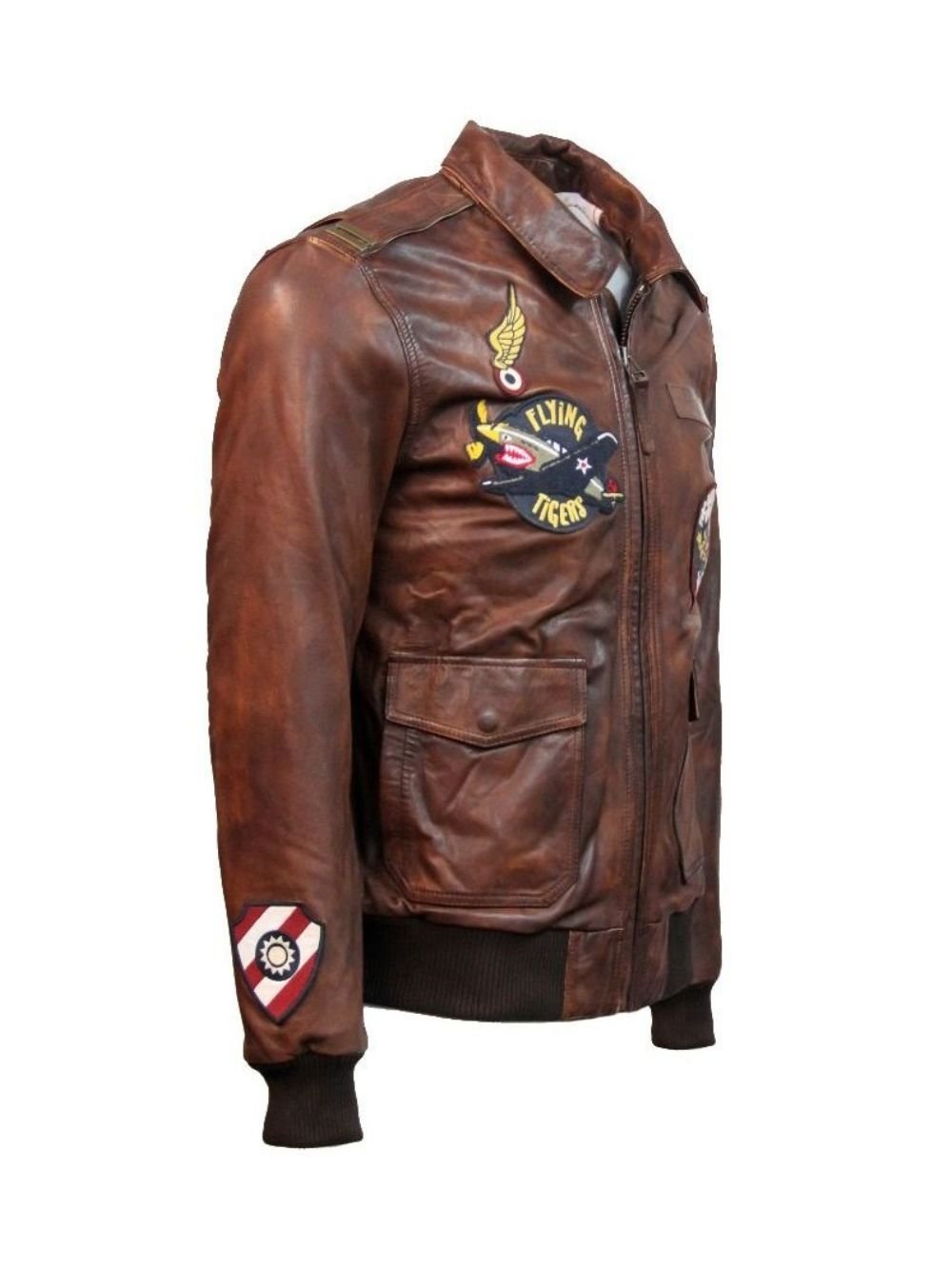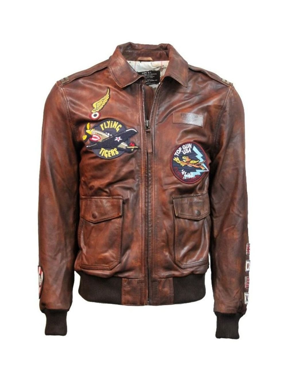 Top Gun Flying Tigers Shirt Style Brown Bomber Zip Up Leather Bomber Jacket