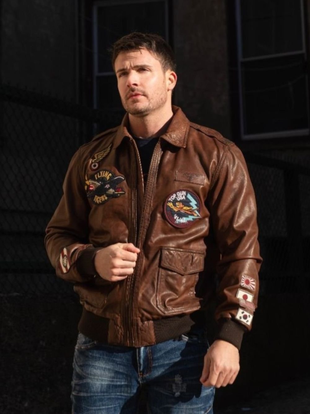 The distinctive brown color of the Pete Mitchell Jacket brings your fantasy of wearing a modern outfit to life. This outfit is an excellent addition to your wardrobe because it is composed of genuine leather. This Top Gun Flying Tigers Brown Zip Up Leather Bomber Jacket is incredibly soft and delicate due to the viscose inside, allowing you to wear it all day without gaining any more weight. Thanks to the shirt-style collar, this outfit will enhance your individuality with pure elegance. You can find embroidered patches on the front and the zippered closure sleeves. This outfit’s full-length sleeves with rib-knitted cuffs give you a stunning appearance and feel. Two side pockets and two flap pockets are present.