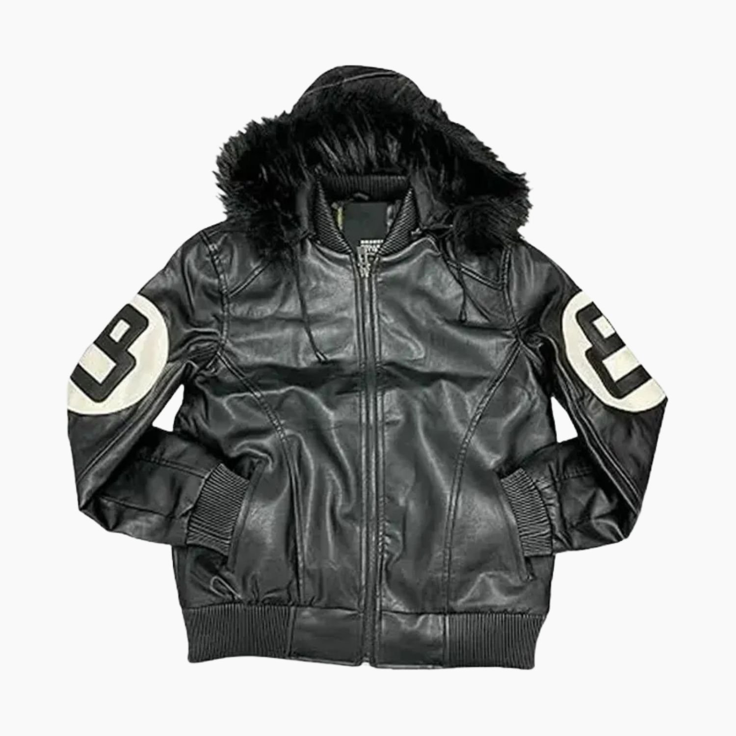 Men’s and Women’s 8 Ball Black Bomber Leather Jacket with Fur Hood