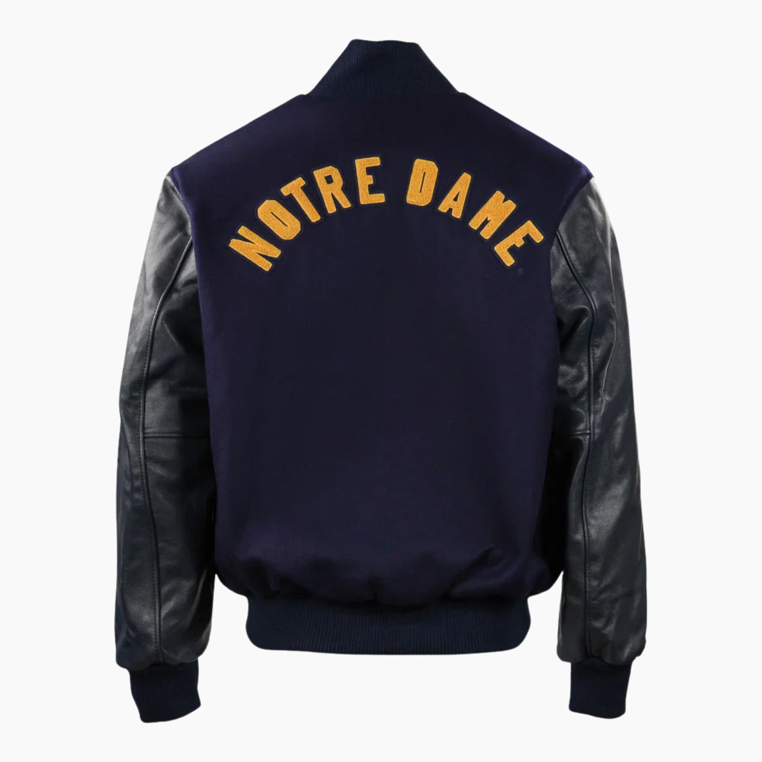 Crafted from premium navy wool and genuine navy leather sleeves, it’s built to offer durability and sophistication. The gold chenille patch detailing on the front and back proudly showcases your Notre Dame pride, while the wool-knit trim adds that classic collegiate touch.