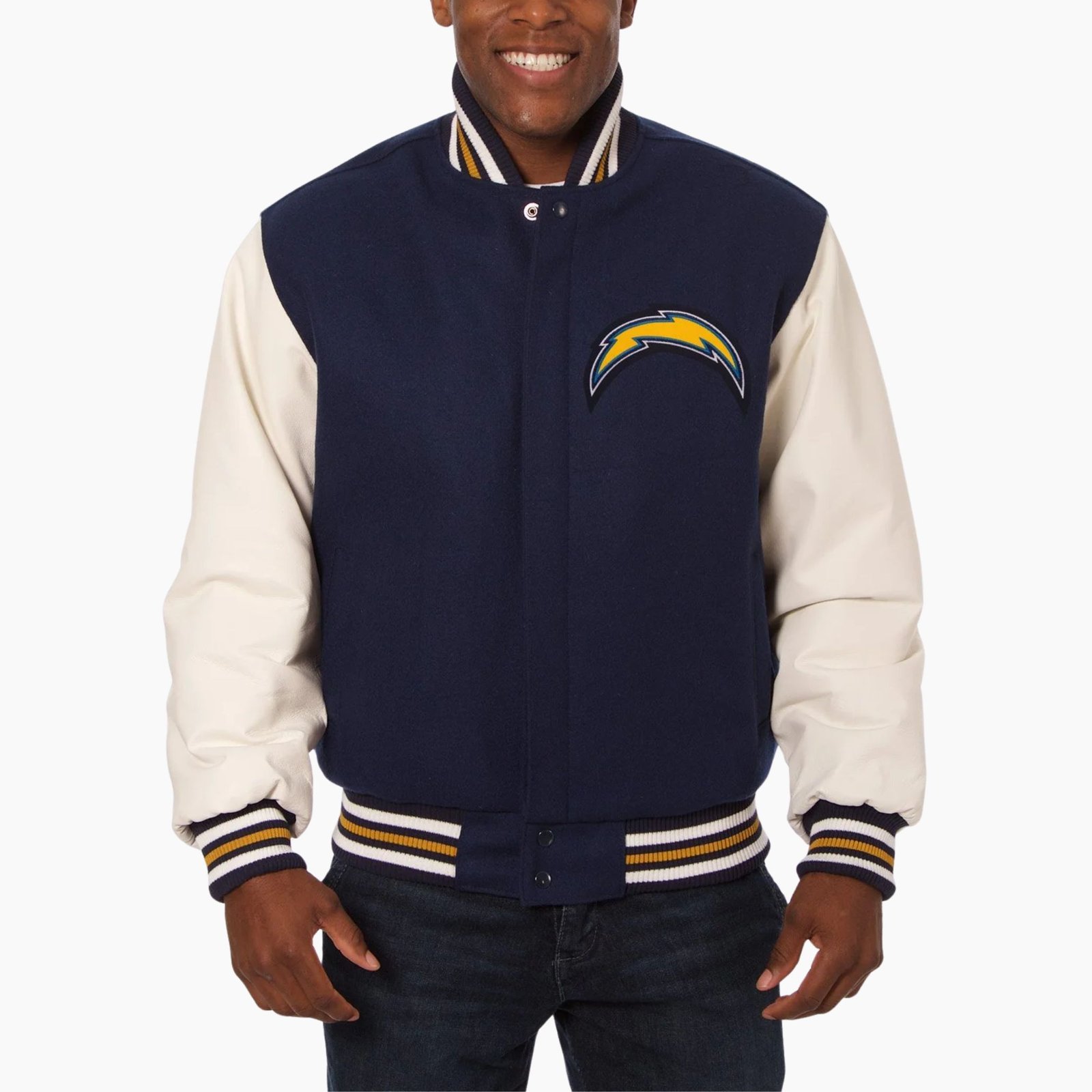 Varsity LA Chargers Navy Blue and White Wool Leather Jacket