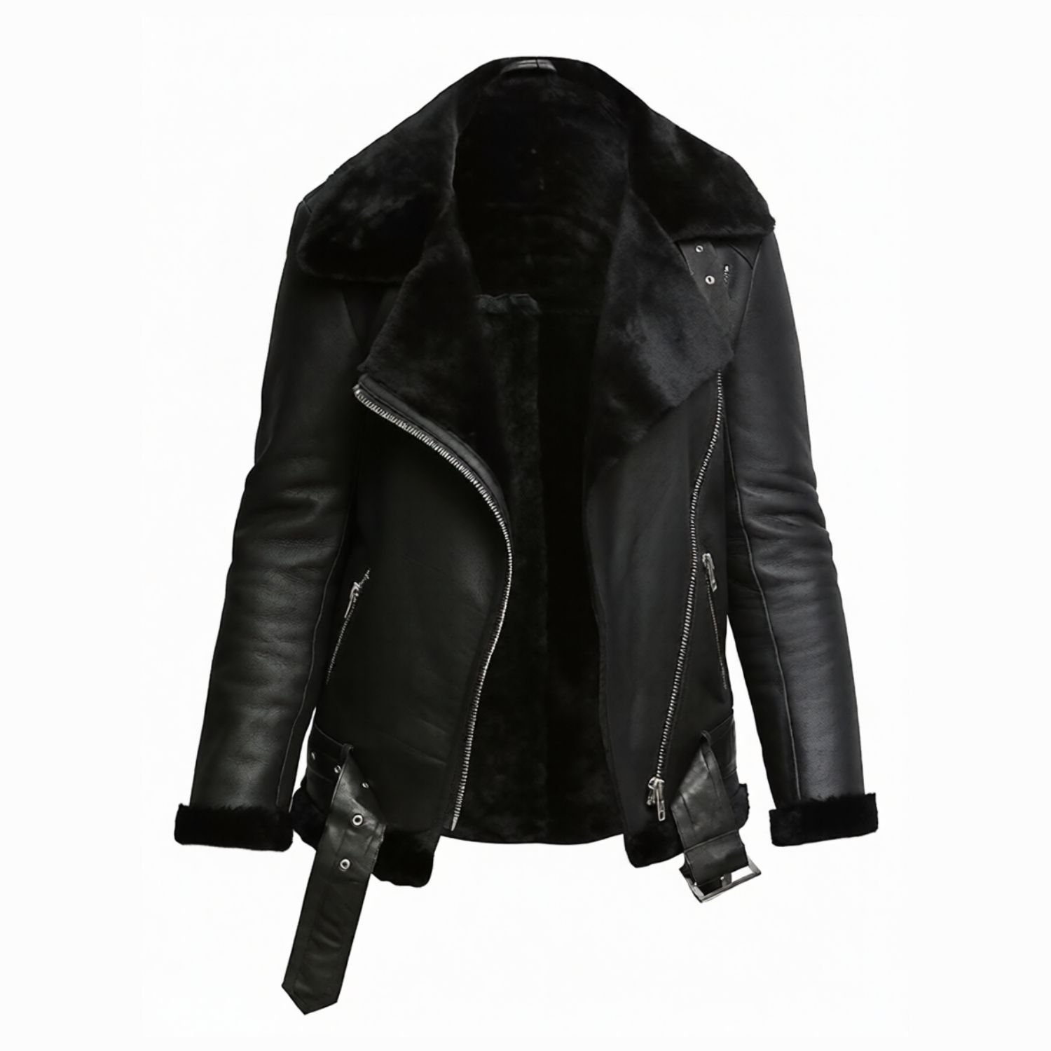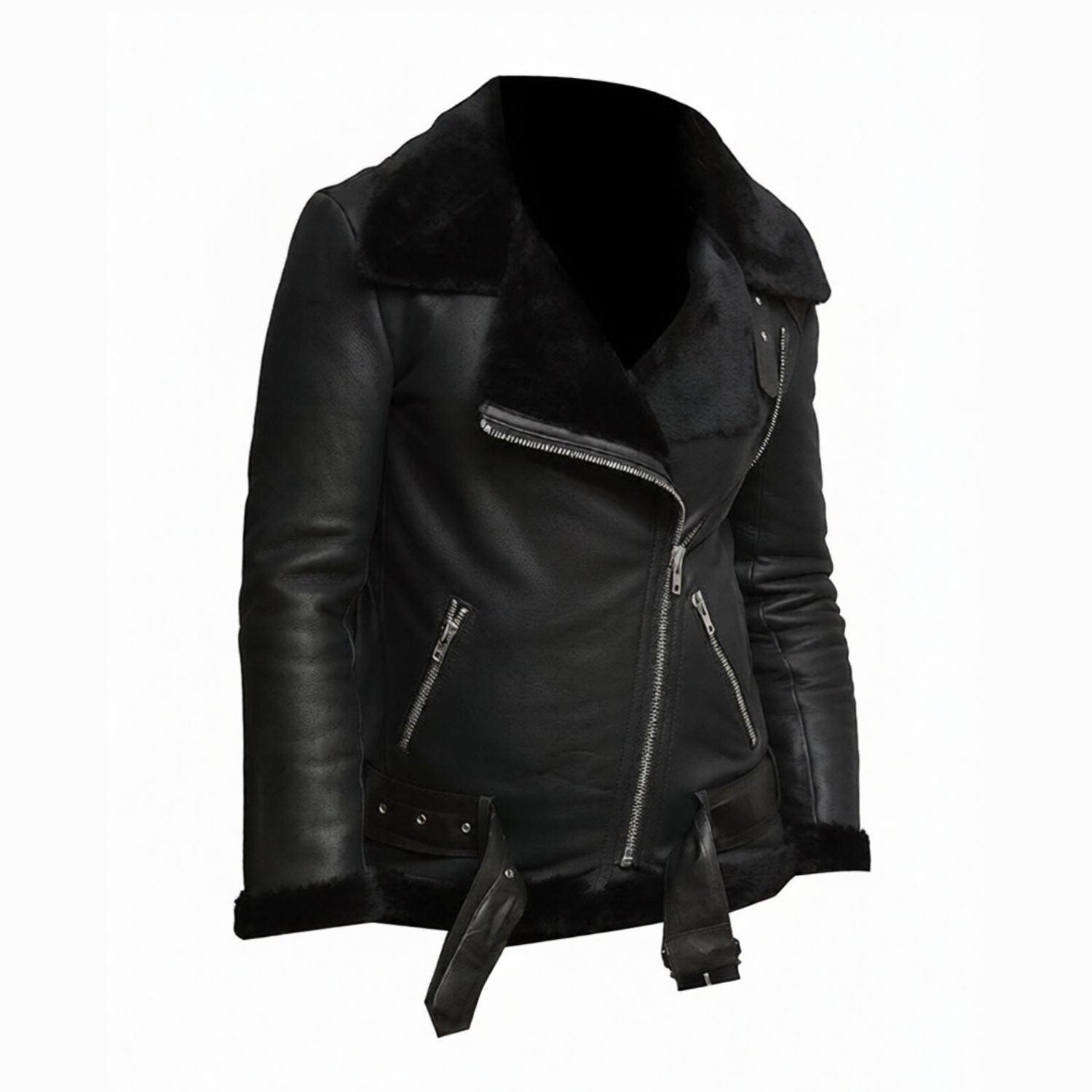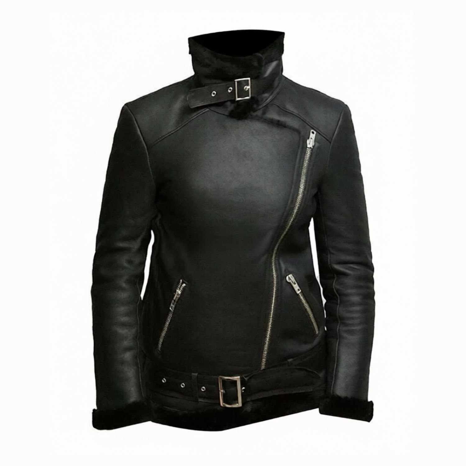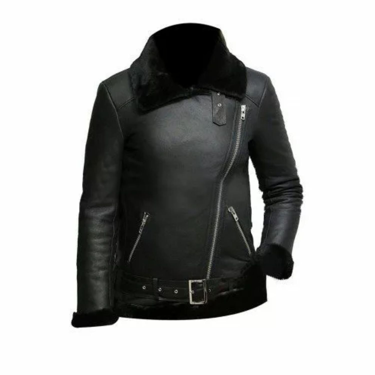 Victoria Pilot Aviator Shearling Sheepskin Fur Leather Black Jacket has exciting features that captivate the public’s attention. The stylish jacket is made from Finest Quality Genuine Sheepskin Leather. The Two Waist Side Zipper and Inside Pockets give a chic look. It has a lovely Stand-Up and Lapel Style Fur Collar. The full-length sleeves are complemented with an open hem fur style cuff. Its interior is lined with shearling fur that gives the best protection and keeps it warm. The stylish Heavy Duty YKK Zipper is used in the front, which enhances its appeal.