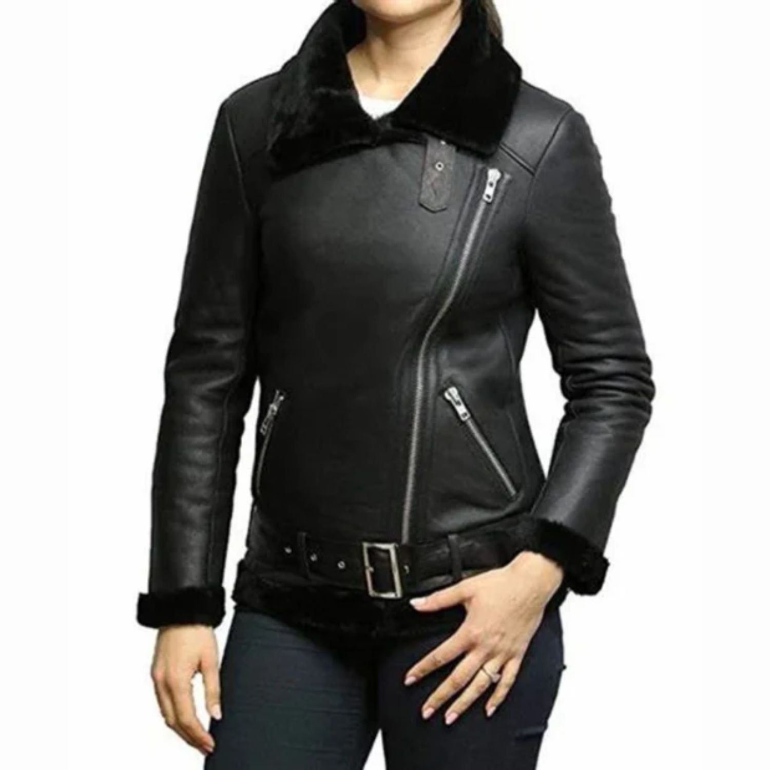 Shearling Jackets have great appeal to fashionistas. They look chic and protect you in the harsh winter season. Movie Jackets Hub has come up with a fantastic collection of womens shearling jacket. Take a look at this cozy Victoria Black Aviator Shearling Sheepskin Jacket. It is a trending outfit from our latest collection. The jacket is ideal for parties and gatherings. You can wear it with any jeans, trousers & shirt/t-shirt.