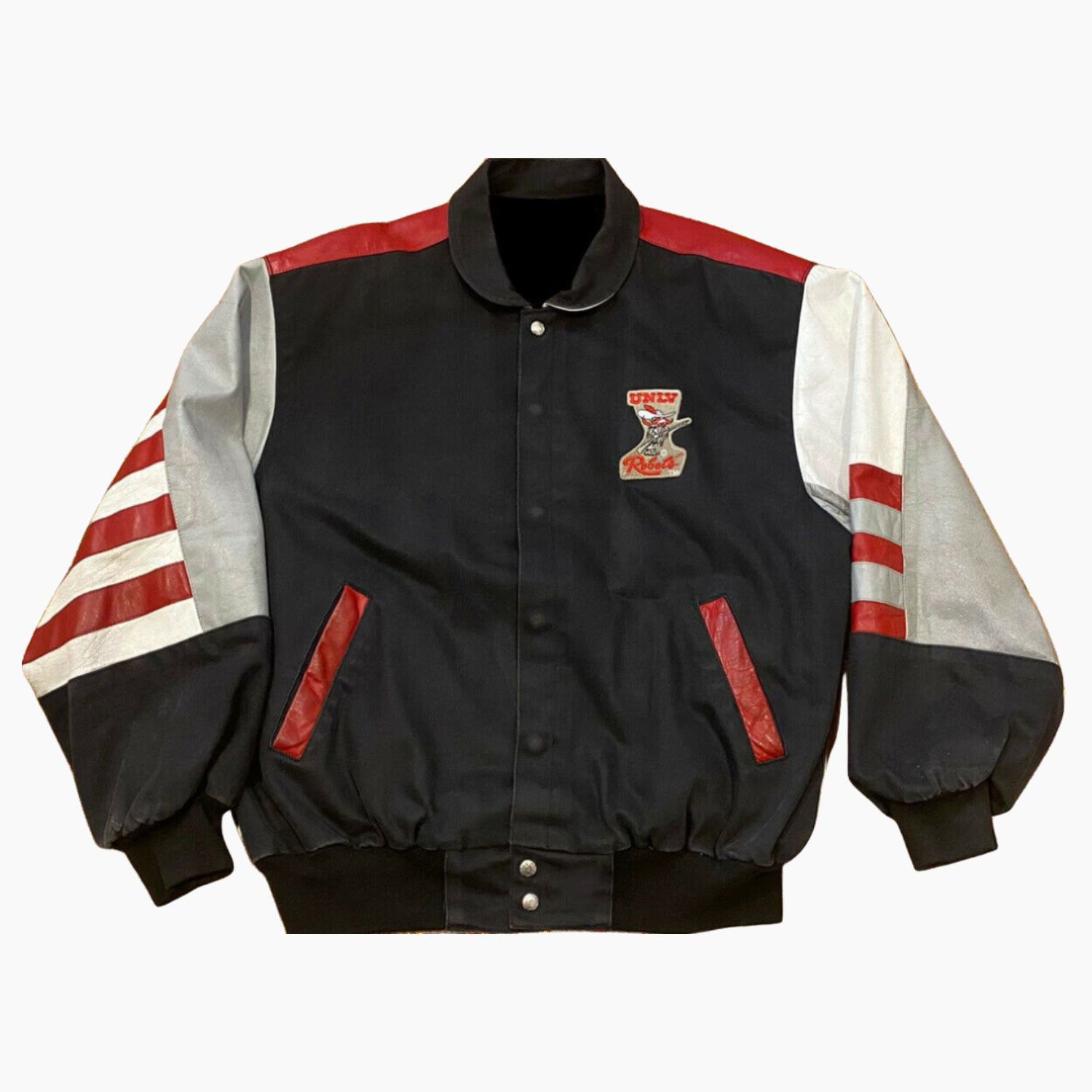 Step into a golden era of collegiate sports and high-end street fashion with the Vintage UNLV Rebels NCAA Varsity Jacket, a masterpiece crafted by the legendary designer Jeff Hamilton. Known for his iconic “wearable art” that dominated the 1990s, Hamilton brought a unique level of luxury to sports apparel, and this UNLV Rebels piece is a shining example of that heritage. This jacket is meticulously constructed with a hybrid outer shell featuring premium genuine leather and high-grade cotton, offering a sophisticated contrast in textures that feels substantial and durable. The sleek black colorway provides a powerful backdrop for the bold University of Nevada, Las Vegas branding, making it a versatile statement piece that honors the “Runnin’ Rebels” spirit with undeniable authority.