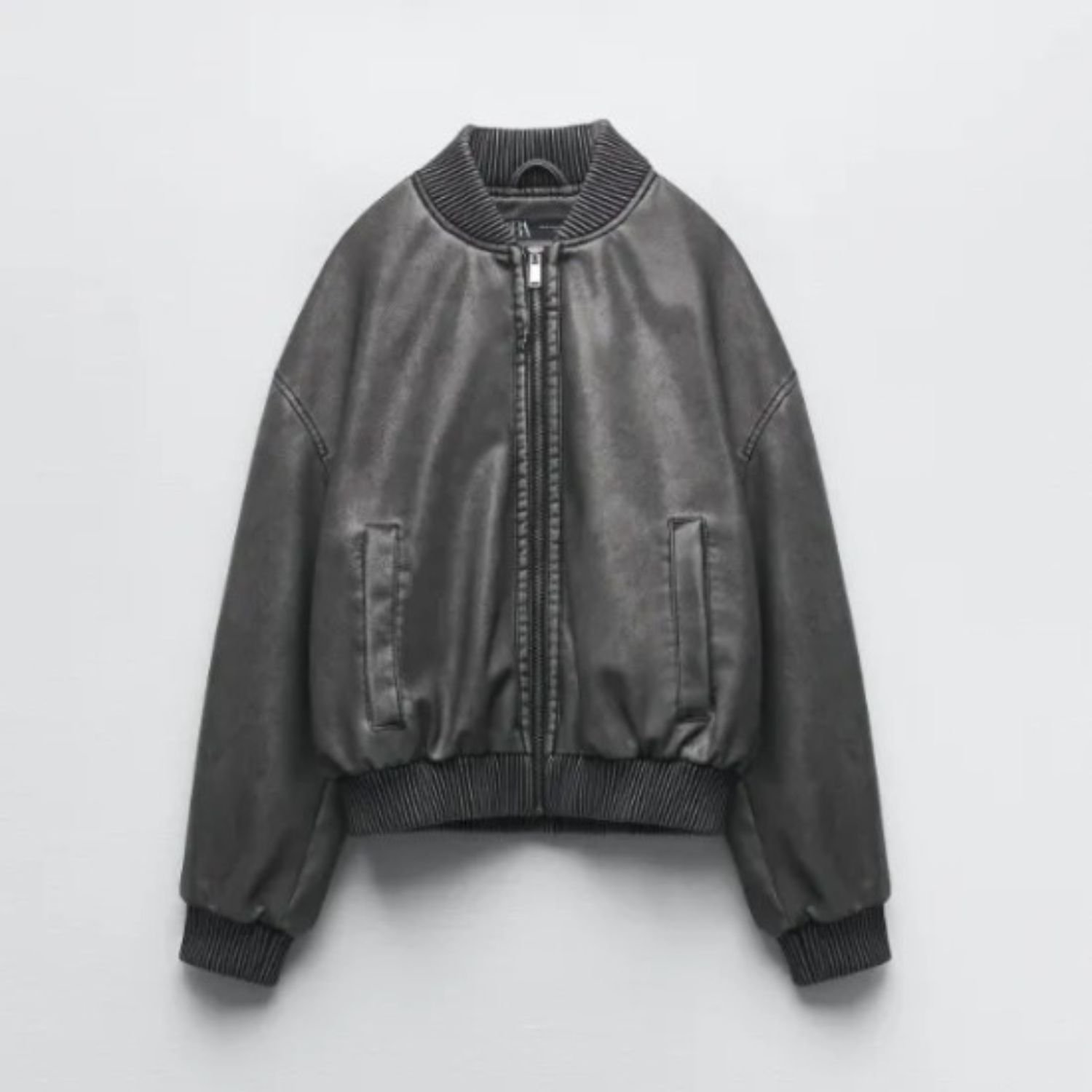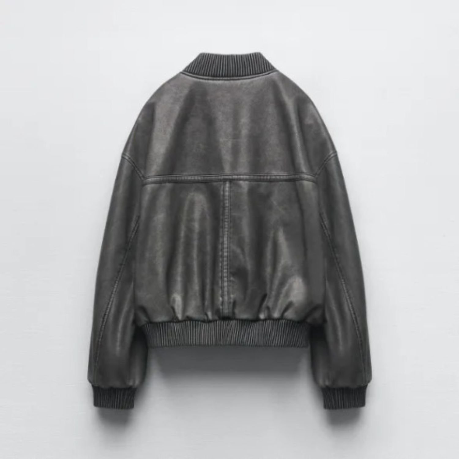 Grey Zara Washed Effect Leather Bomber Jacket