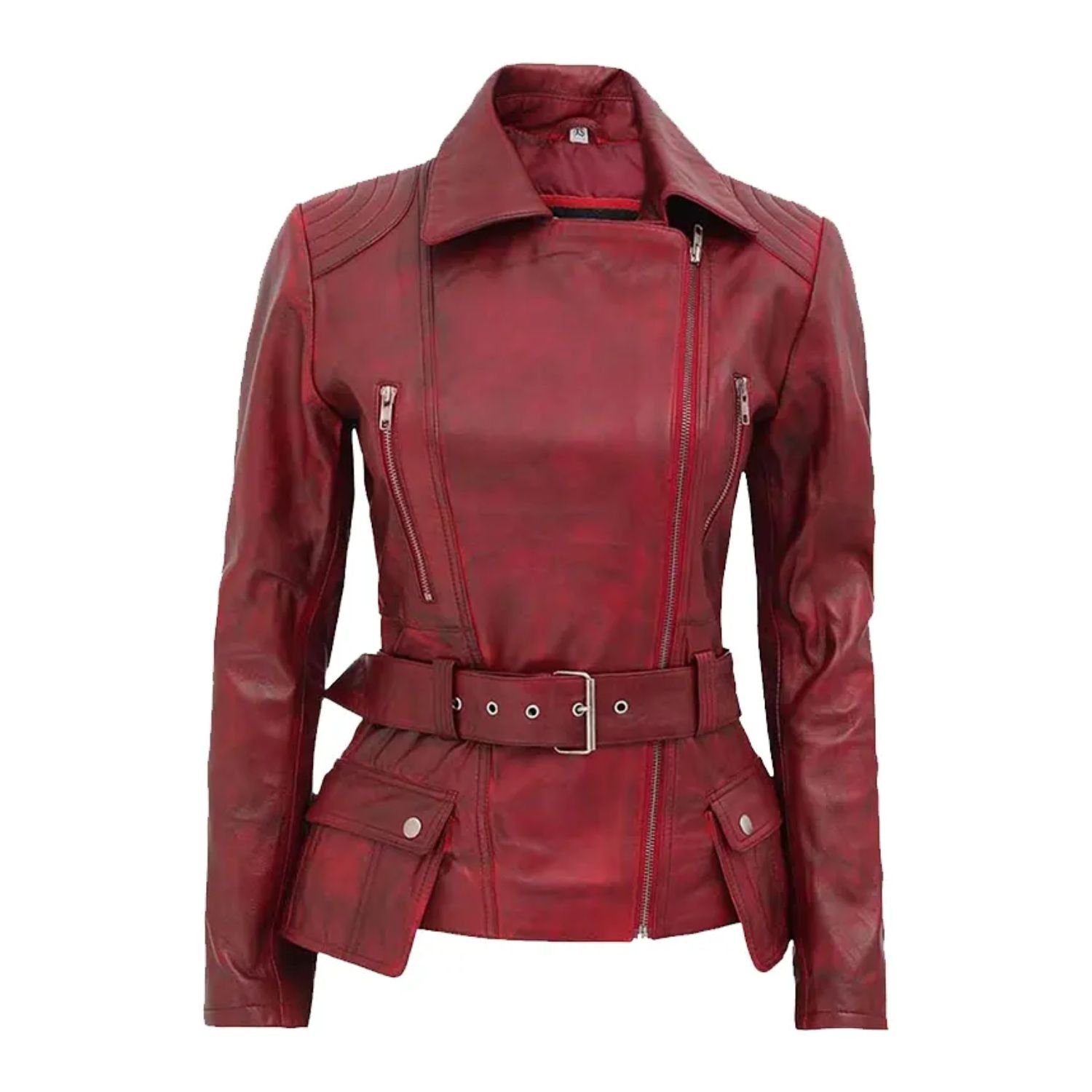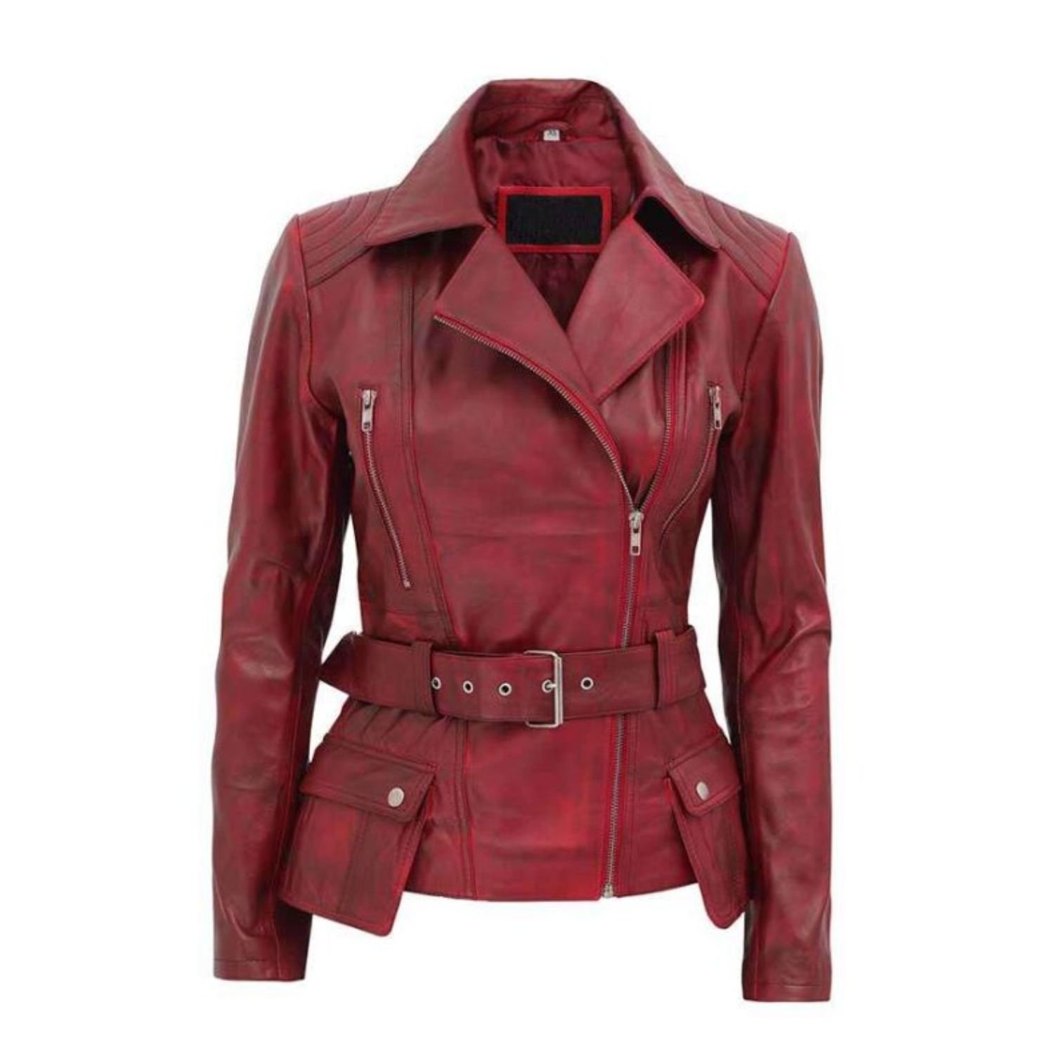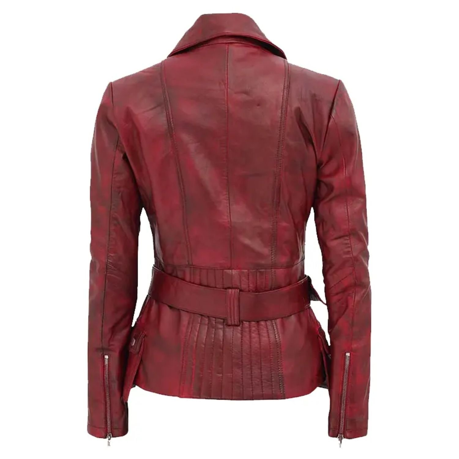 Women’s distressed Burgundy biker zipper closure jacket is the most trendy and most adorable-looking. Not just that, the jacket distressed leather biker jacket fabricates with the high-class and most durable sheepskin leather. In addition to that, its craftsmanship is extra good quality and unique, which makes it more durable. The women’s motorcycle jacket inside has lined with the best quality viscose fabric to provide you with lasting smoothness and ease. Furthermore, We provide all types of jackets of outstanding quality, and this stylish distressed maroon biker jacket is also one of them. You can wear this jacket at any function and party or casual wear for an alluring look. Moreover, the classic and stylish jacket’s branded has adjustable belted hemline closure and YKK zipper closure. giving off a cool look.