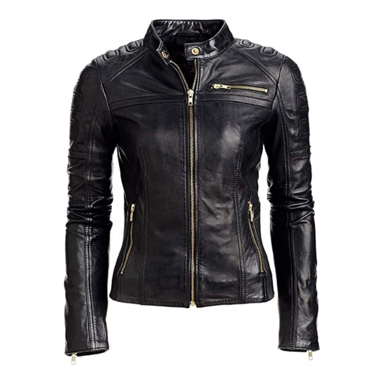 If you are looking for a jacket that gives you a ready-to-go and classy look. This Women Biker Cafe Racer Moto Black Leather Jacket is a perfect match for you. The classy design of the Cafe Racer Moto Jacket is manufactured with bonus and exclusive features. Which include Erect Style Snap Tab Button Collar, zipper cuffs, and ultra-soft viscose inner lining, which gives durability with full most safety.