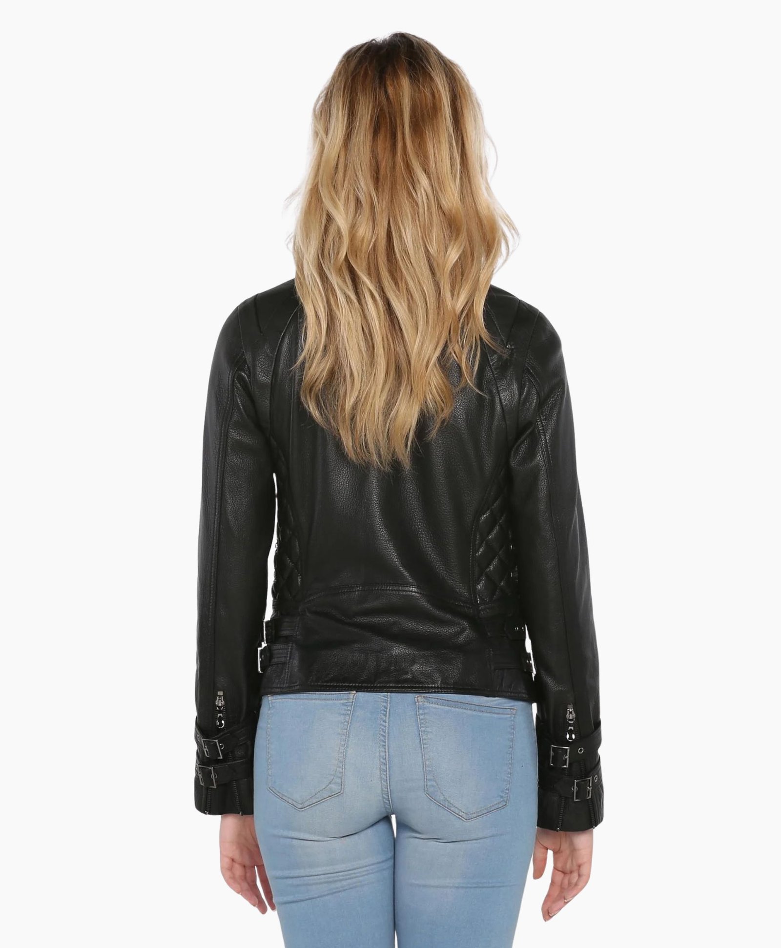 This classic black biker jacket is easy to style and perfect for any occasion. Whether paired with jeans, skirts, or dresses, it adds an instant touch of cool and sophistication to your outfit. Ideal for everyday wear, parties, or casual outings.