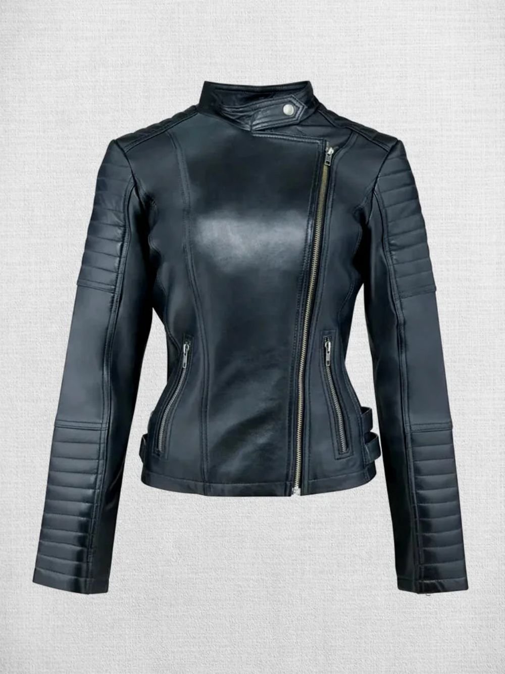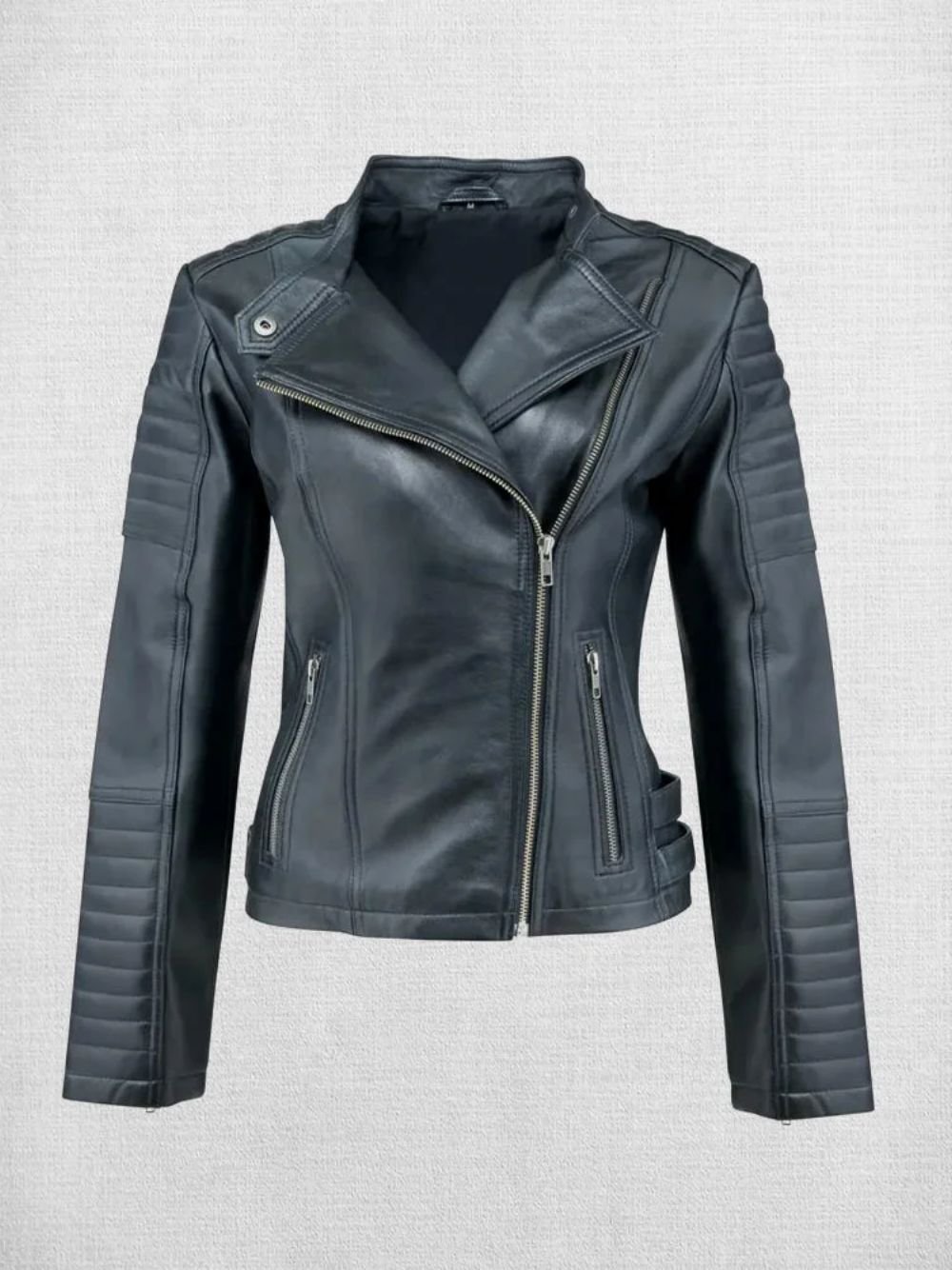 - Front: Asymmetrical Zipper Closure