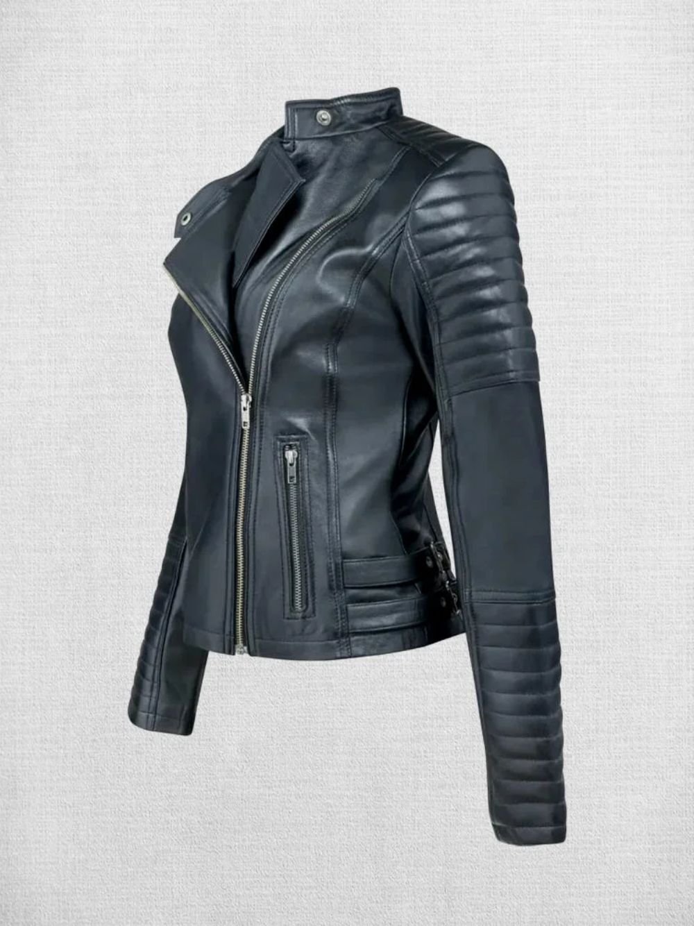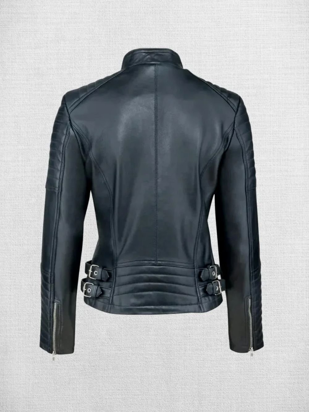 This stylish Women Black Trending Leather Jacket by Movie Jackets Hub with white stripes is the perfect piece for a rock and roll or punk look. Made of high-quality leather, it’s soft and comfortable to wear, and the edgy design will make you stand out from the crowd. The jacket features a classic biker silhouette with a fitted waist and a slightly cropped length. The sleeves are also slightly cropped, and they feature a ribbed cuff for a comfortable and secure fit.