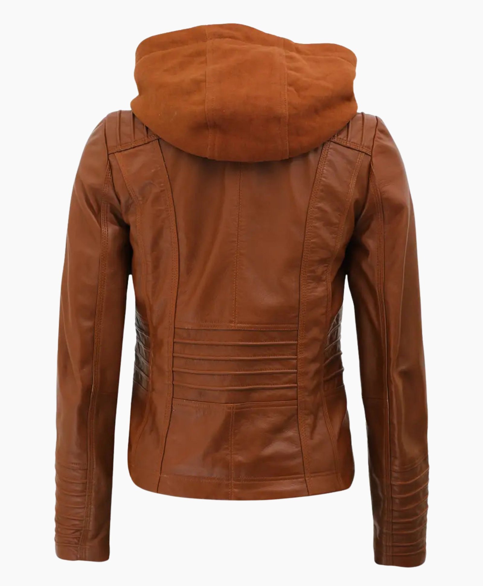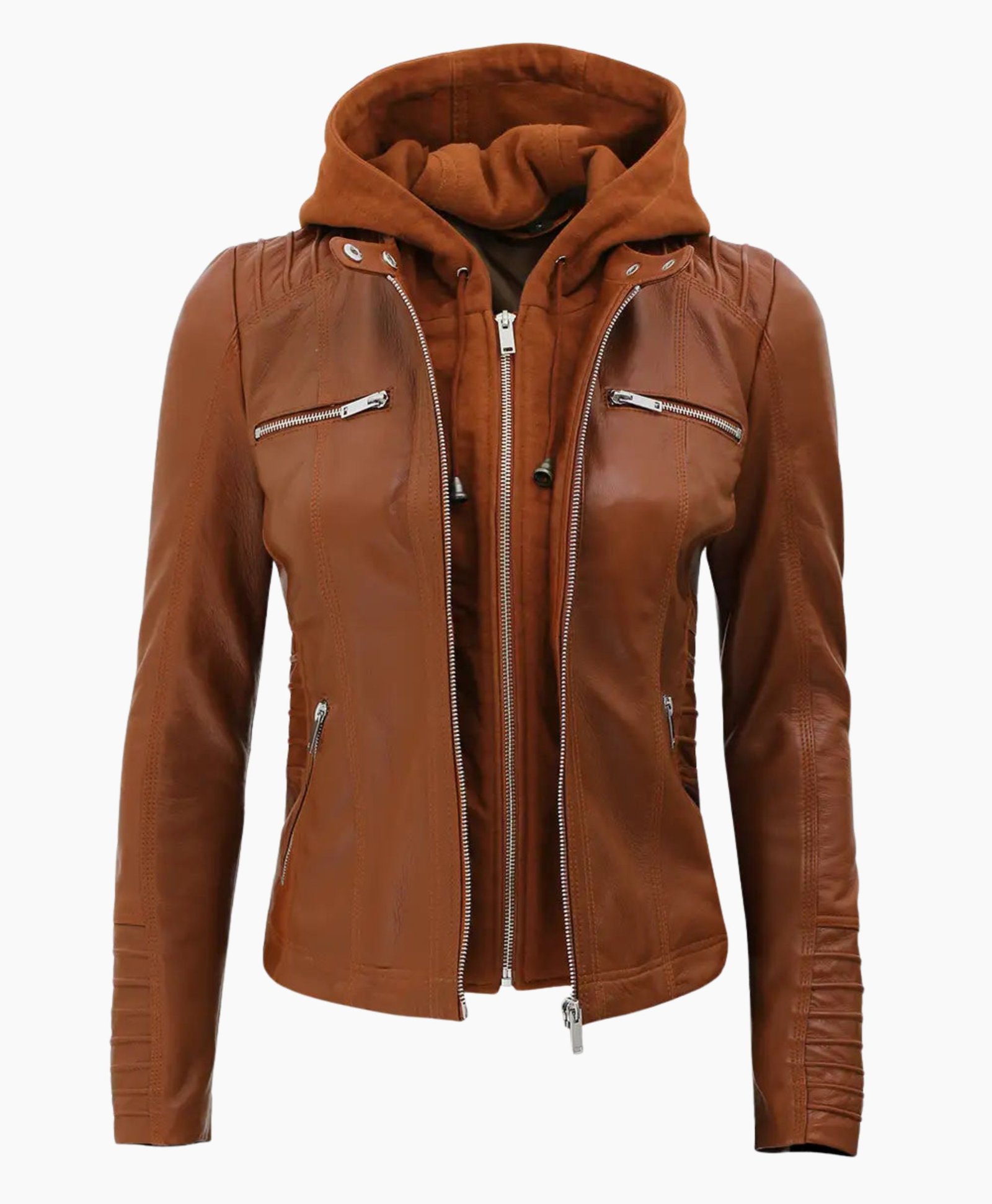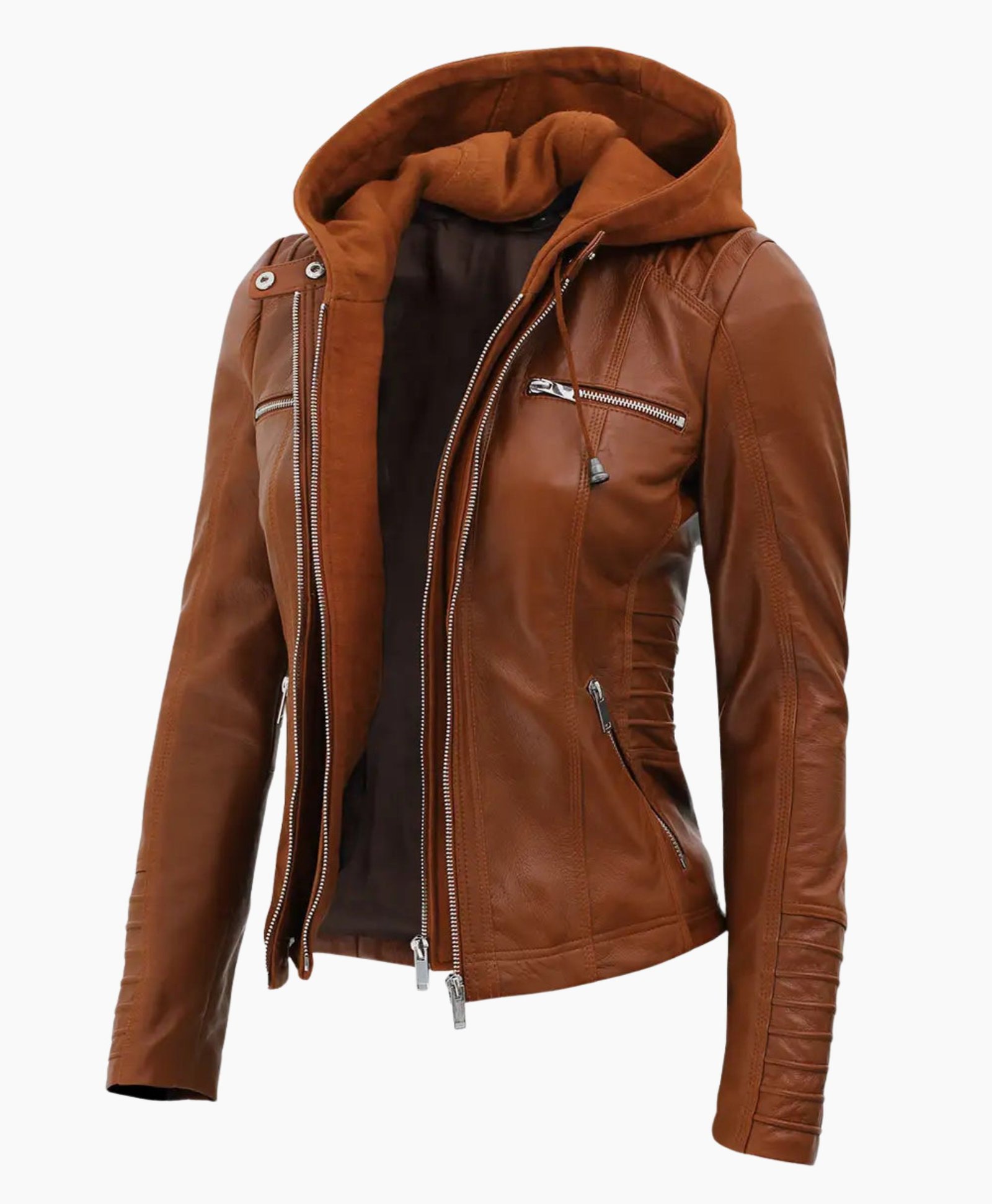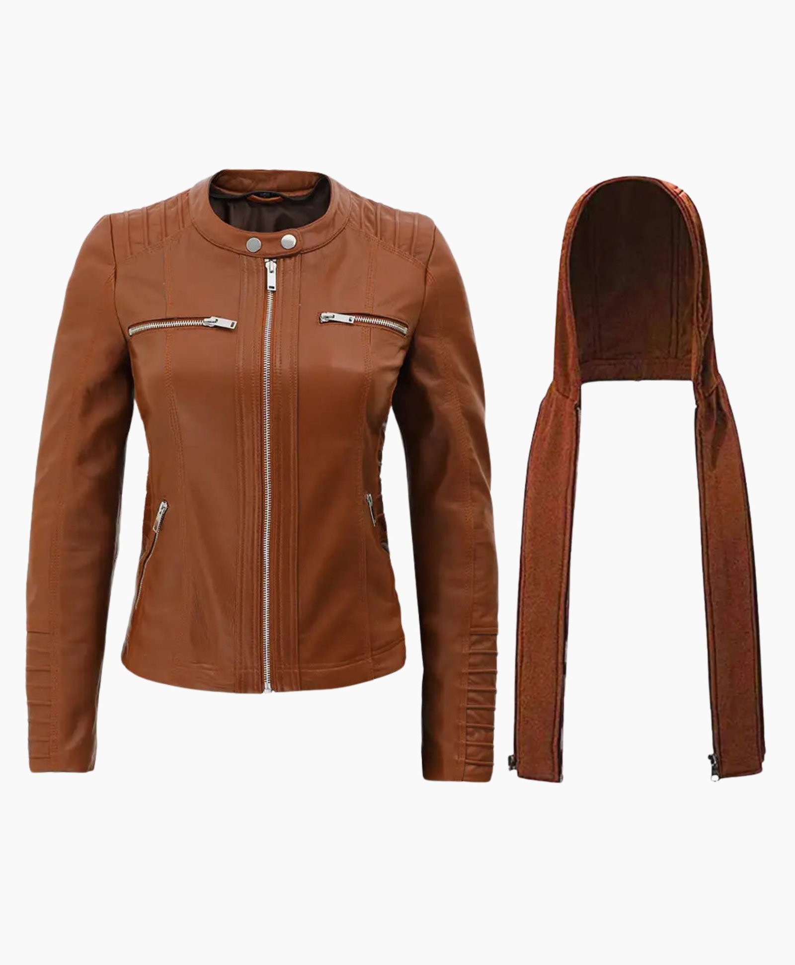 Women’s Brown Leather Jacket with Removable Hood – Versatile & Stylish