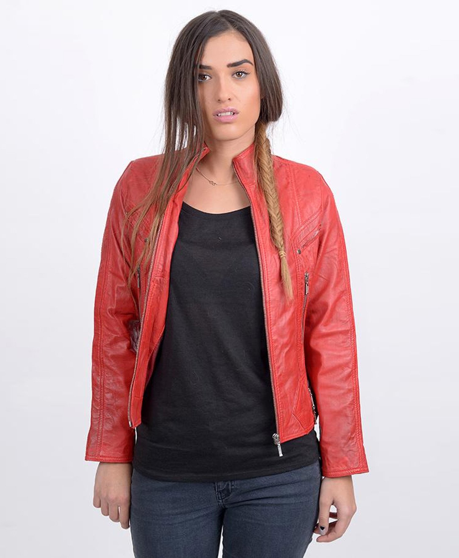 Women Red Bomber Sheepskin Leather Jacket