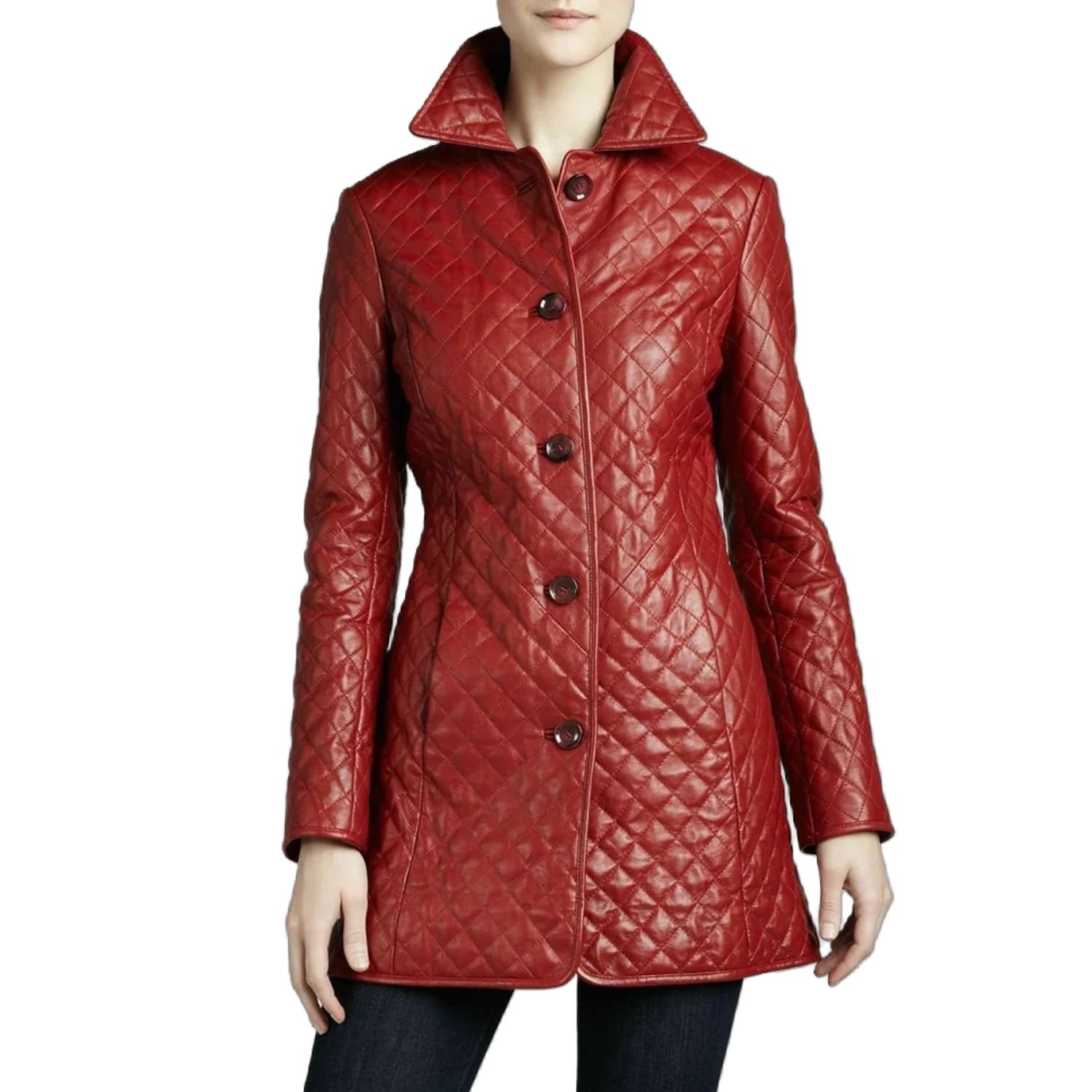 Movie Jacket hub has designed this women’s quilted red coat with spread collar on the top, and button fastening front. It contains long sleeves to give you full-length cover in extreme weather. To make it more comfortable for keeping your carriages it has to side pocket around the waist.