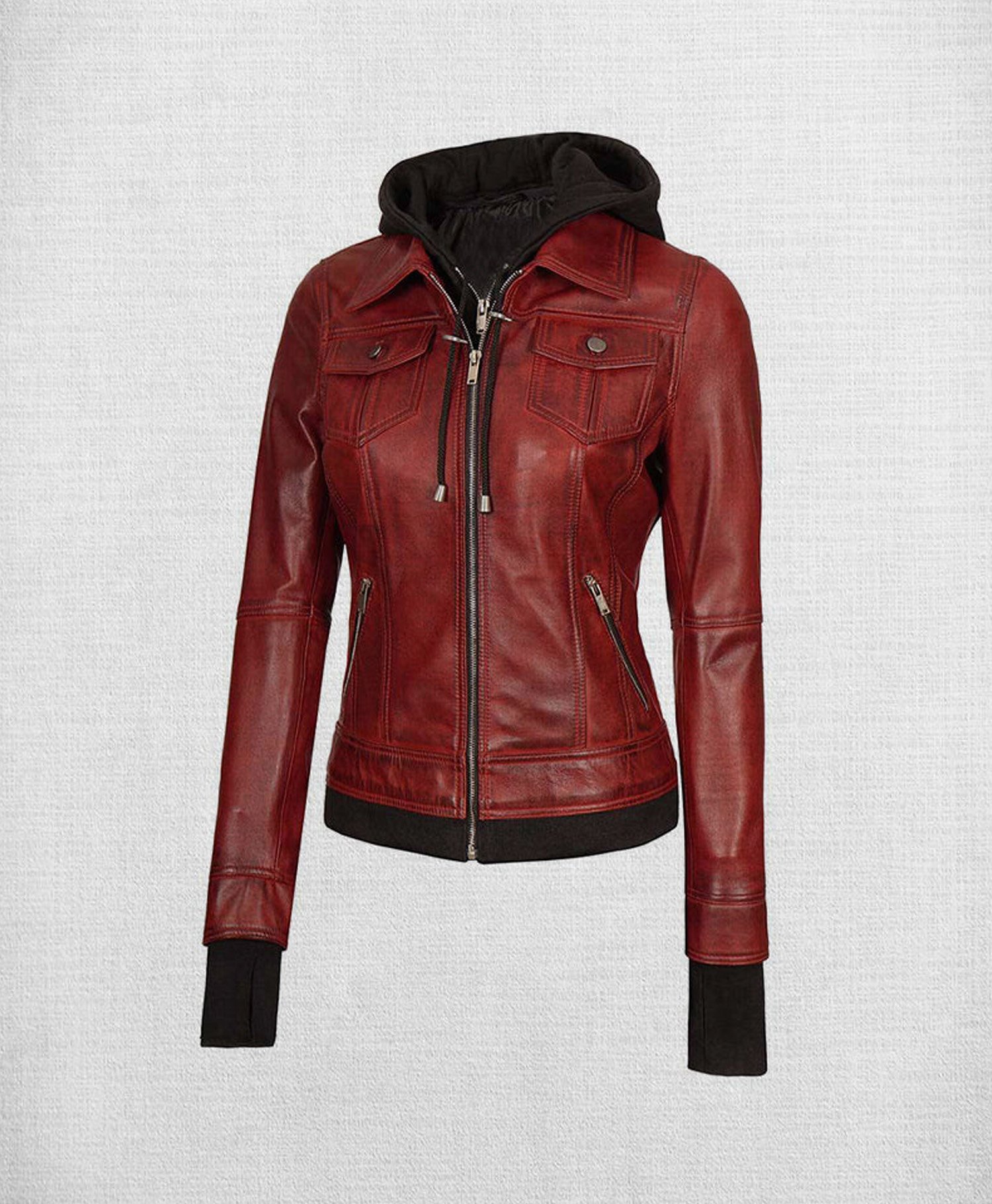 This stunning red leather jacket with hood is the perfect piece for any occasion. Made of high-quality leather, it’s soft and comfortable to wear, and the sleek design will make you look and feel your best. The jacket features a classic biker silhouette with a fitted waist and a slightly cropped length. The sleeves are also slightly cropped, and they feature a ribbed cuff for a comfortable and secure fit.