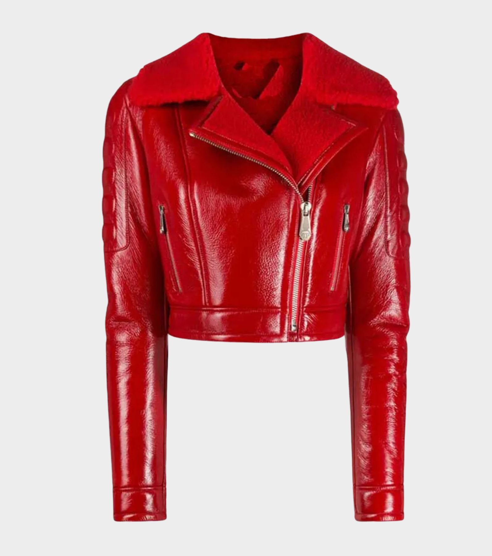 Finished in a striking red color, this jacket makes a confident statement and pairs effortlessly with jeans, boots, or dresses for both casual outings and evening wear.