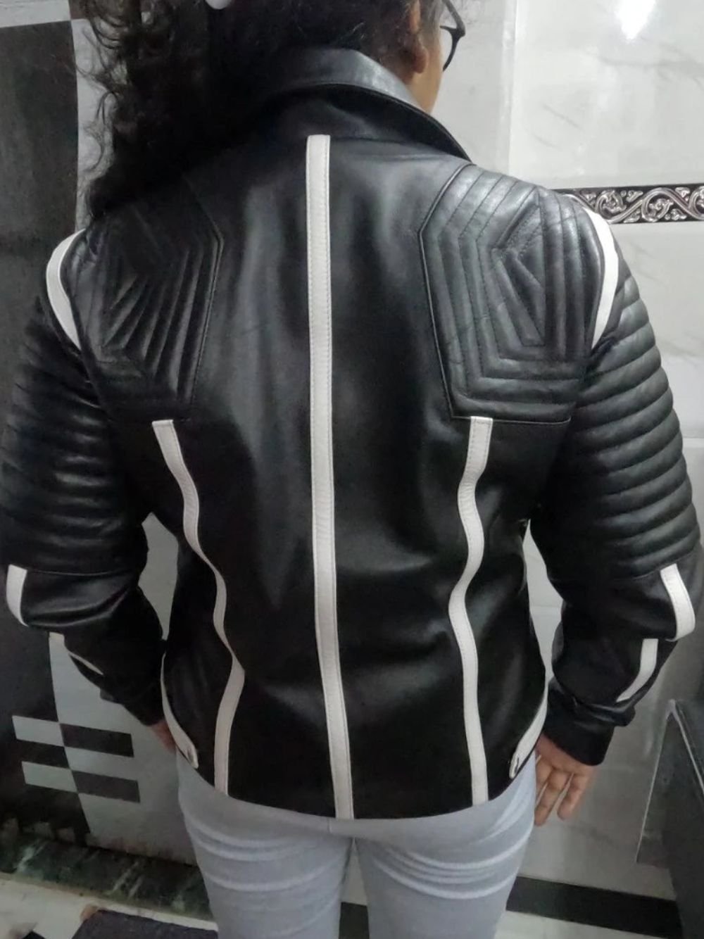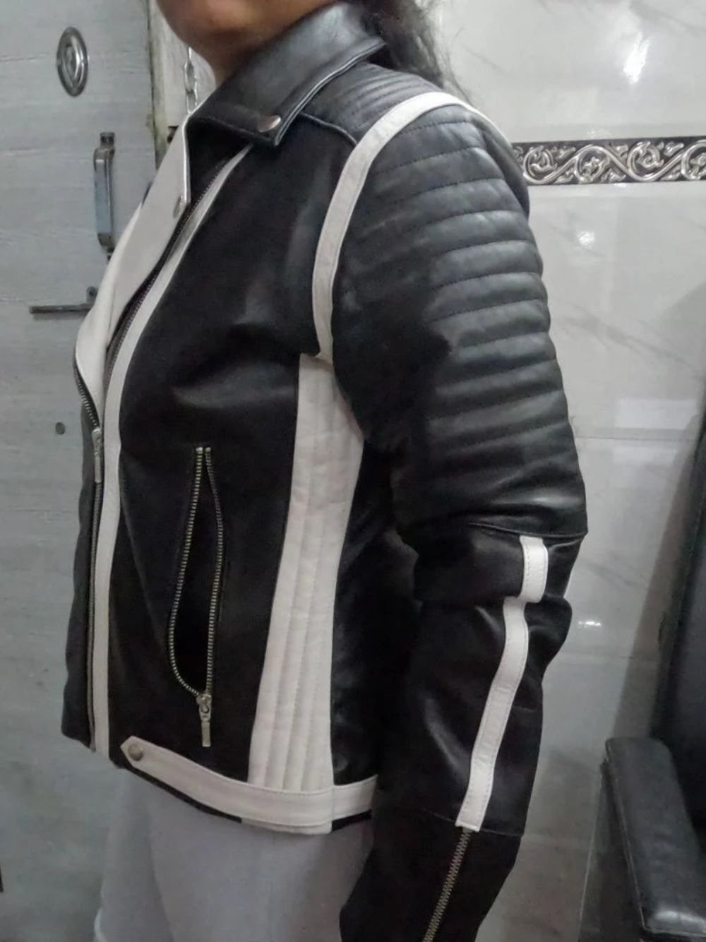Womens Black And White Lambskin Leather Biker Jacket