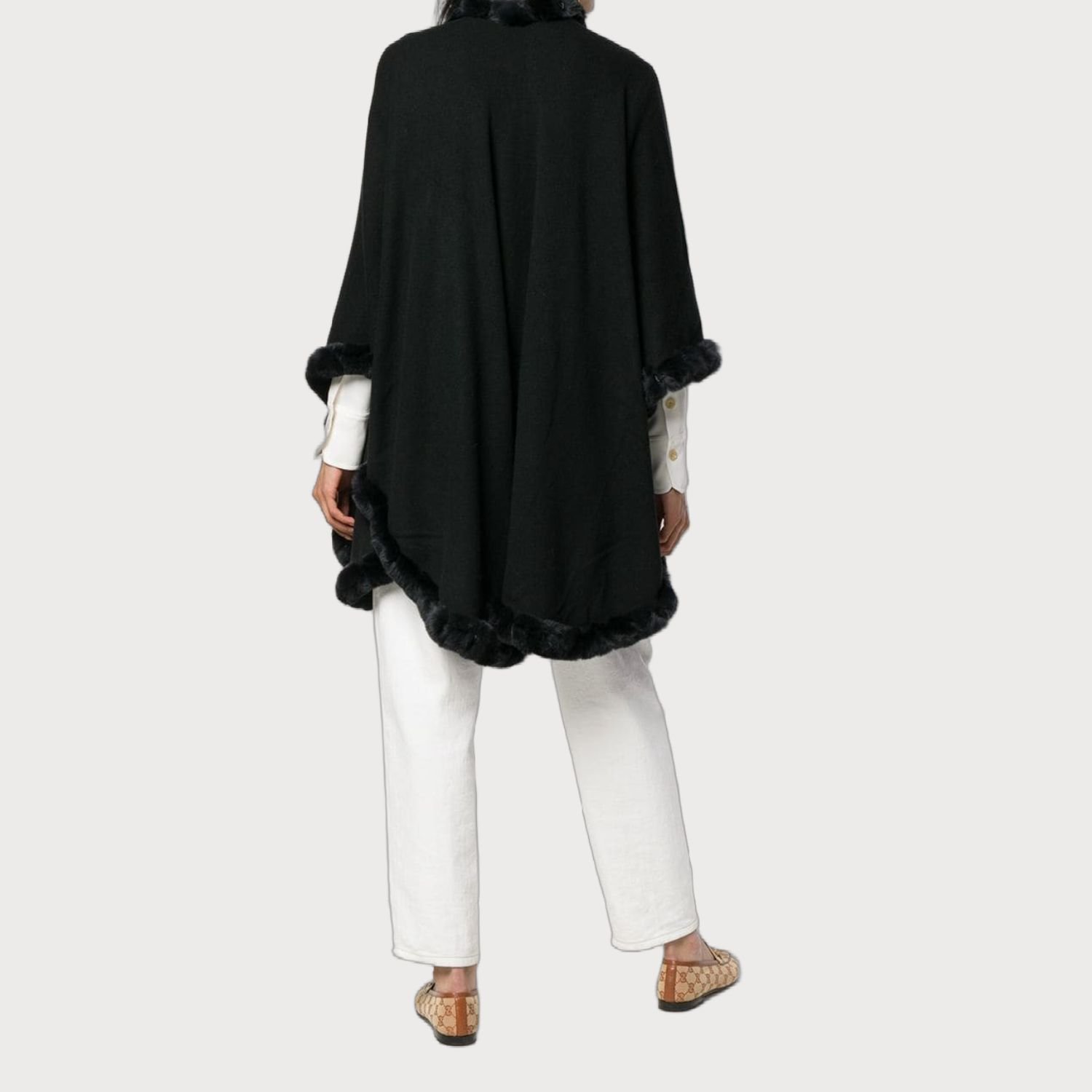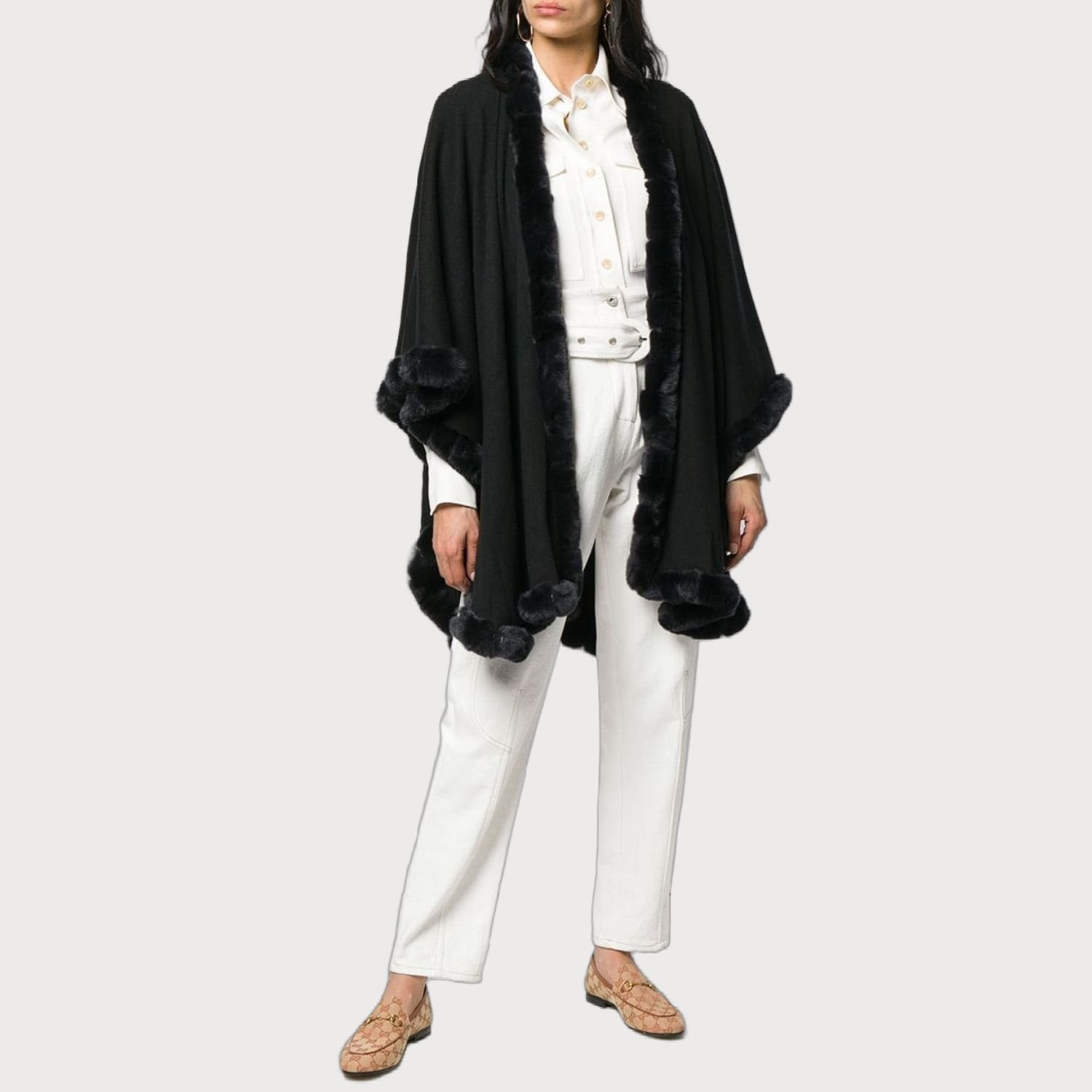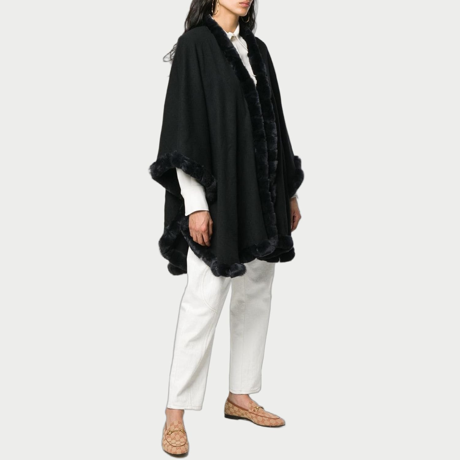 Womens Black Cashmere Rex Fur Trimmed Soft Luxurious Winter Cape Coat