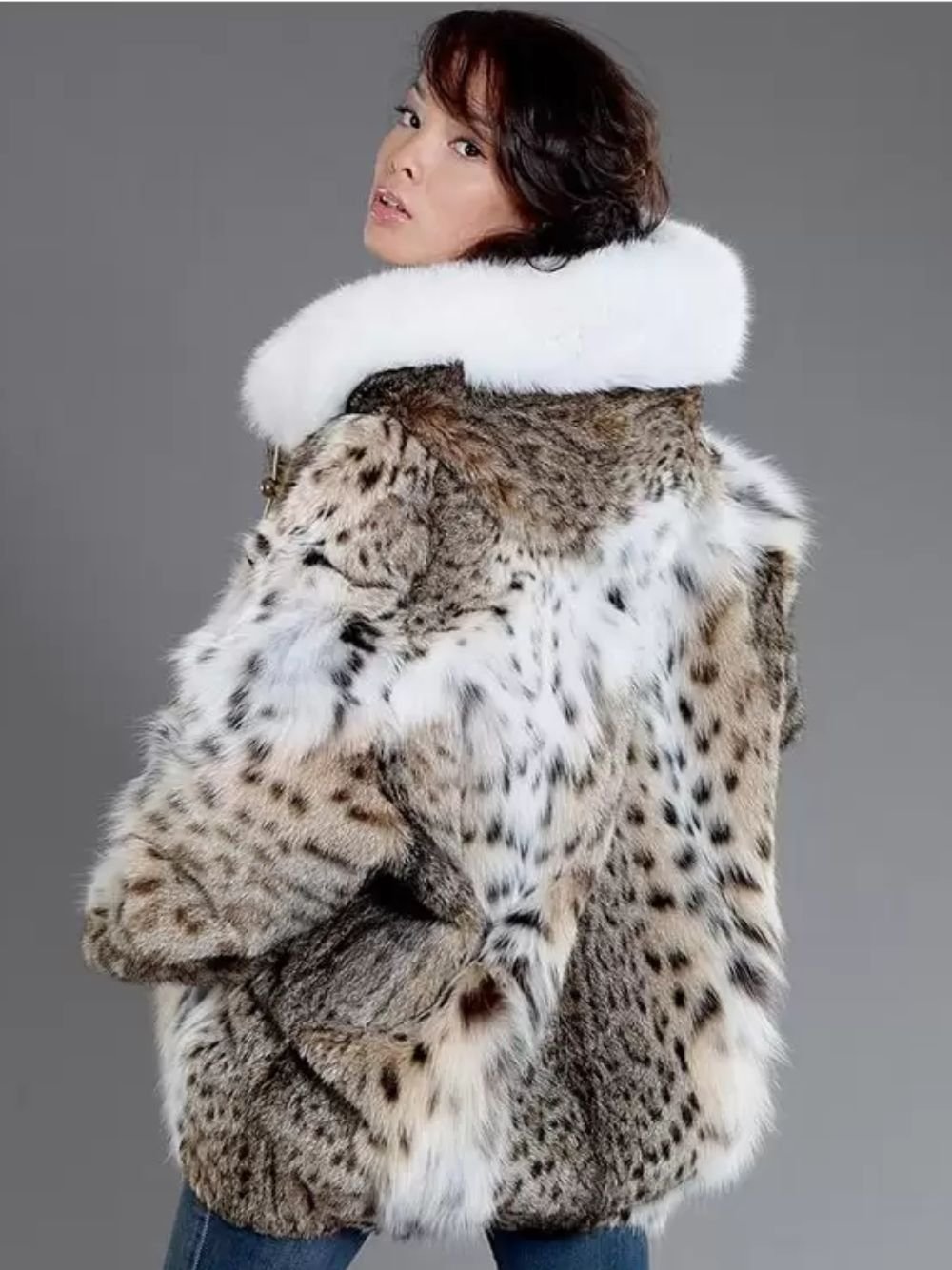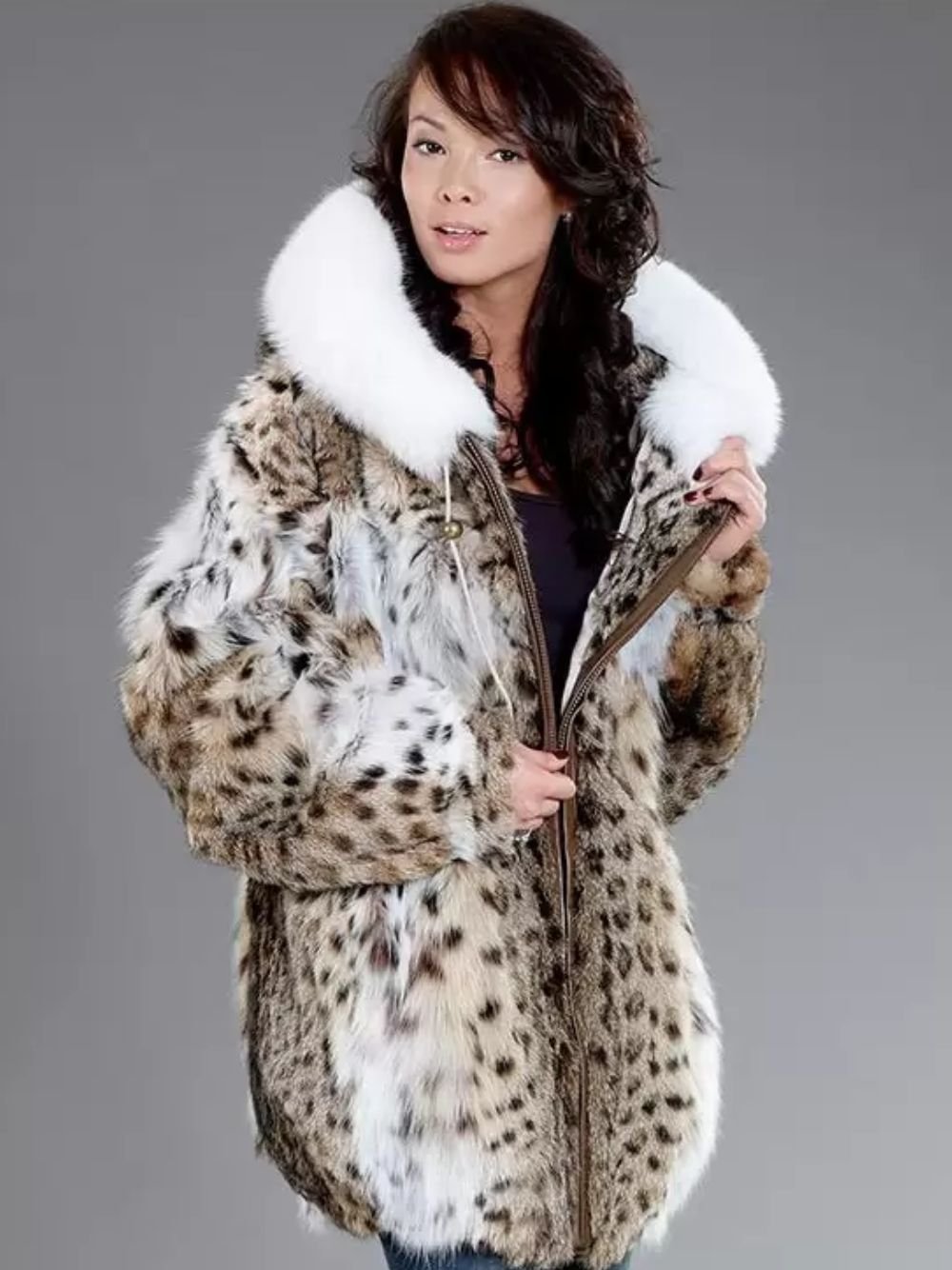 Womens Bobcat Lynx Fur Warm Coat With Hood