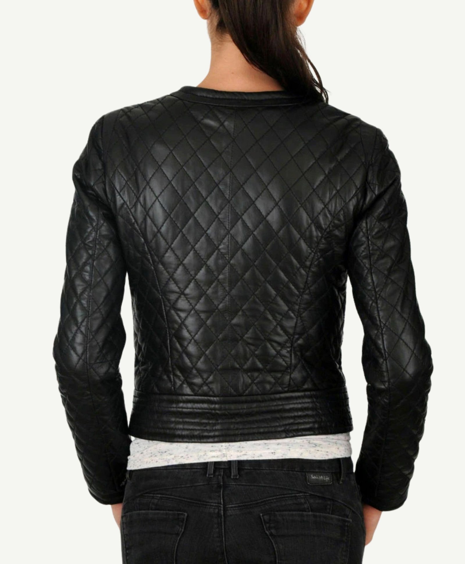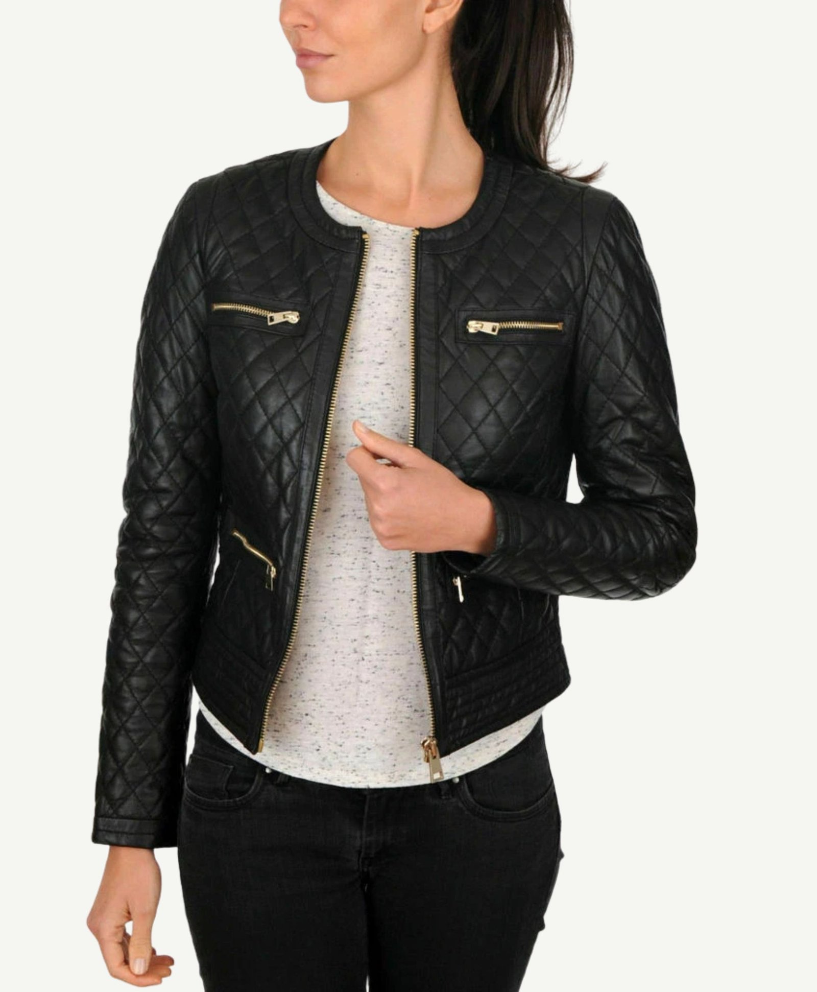 The Womens Collarless Black Quilted Jacket by Movie Jackets Hub is where refined fashion meets everyday comfort. Designed with a clean, modern silhouette, this jacket features a unique collarless cut that brings subtle sophistication to your wardrobe. The elegant black color and quilted design offer a timeless look that pairs effortlessly with casual, smart-casual, or even dressy outfits. Whether you’re running errands or heading out for a night on the town, this jacket gives you a polished yet relaxed vibe.