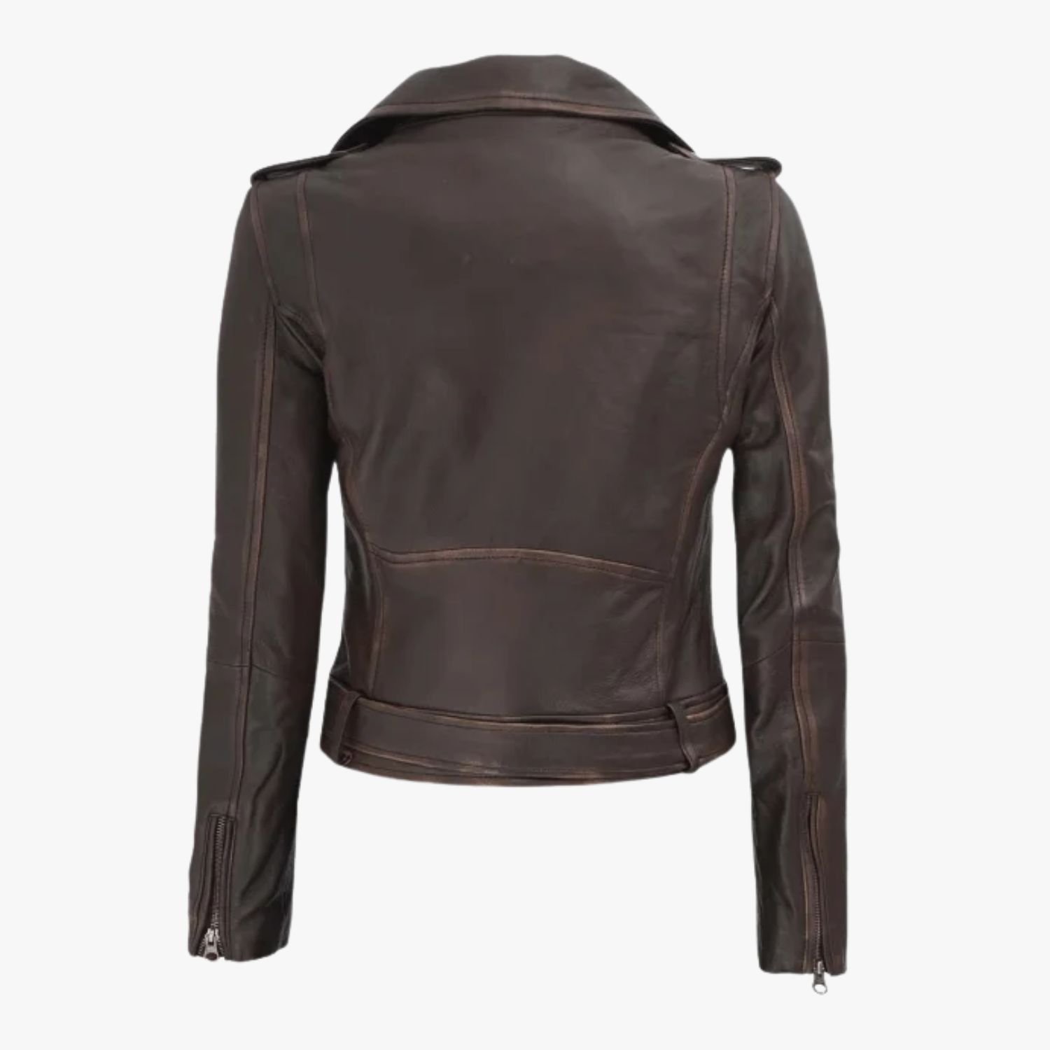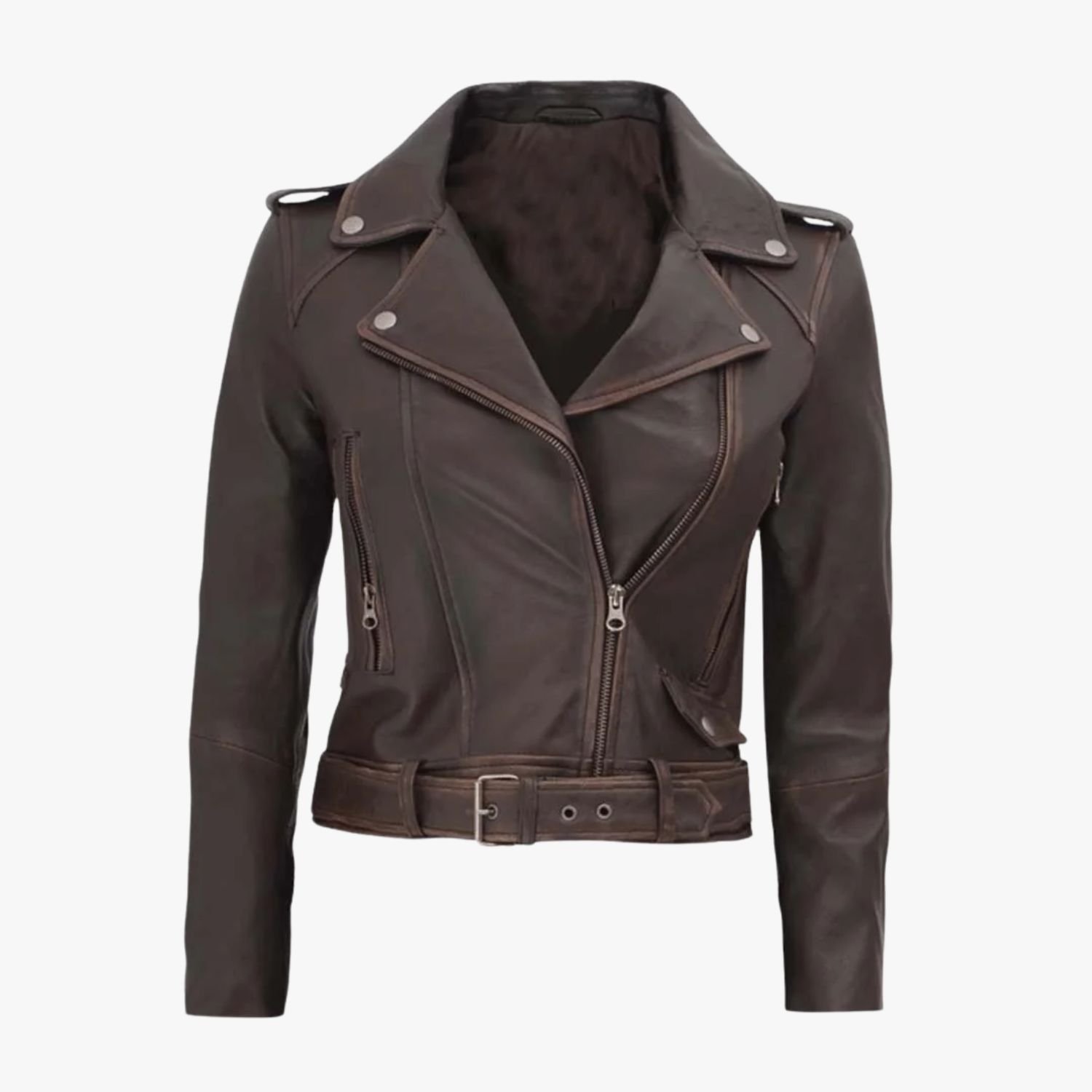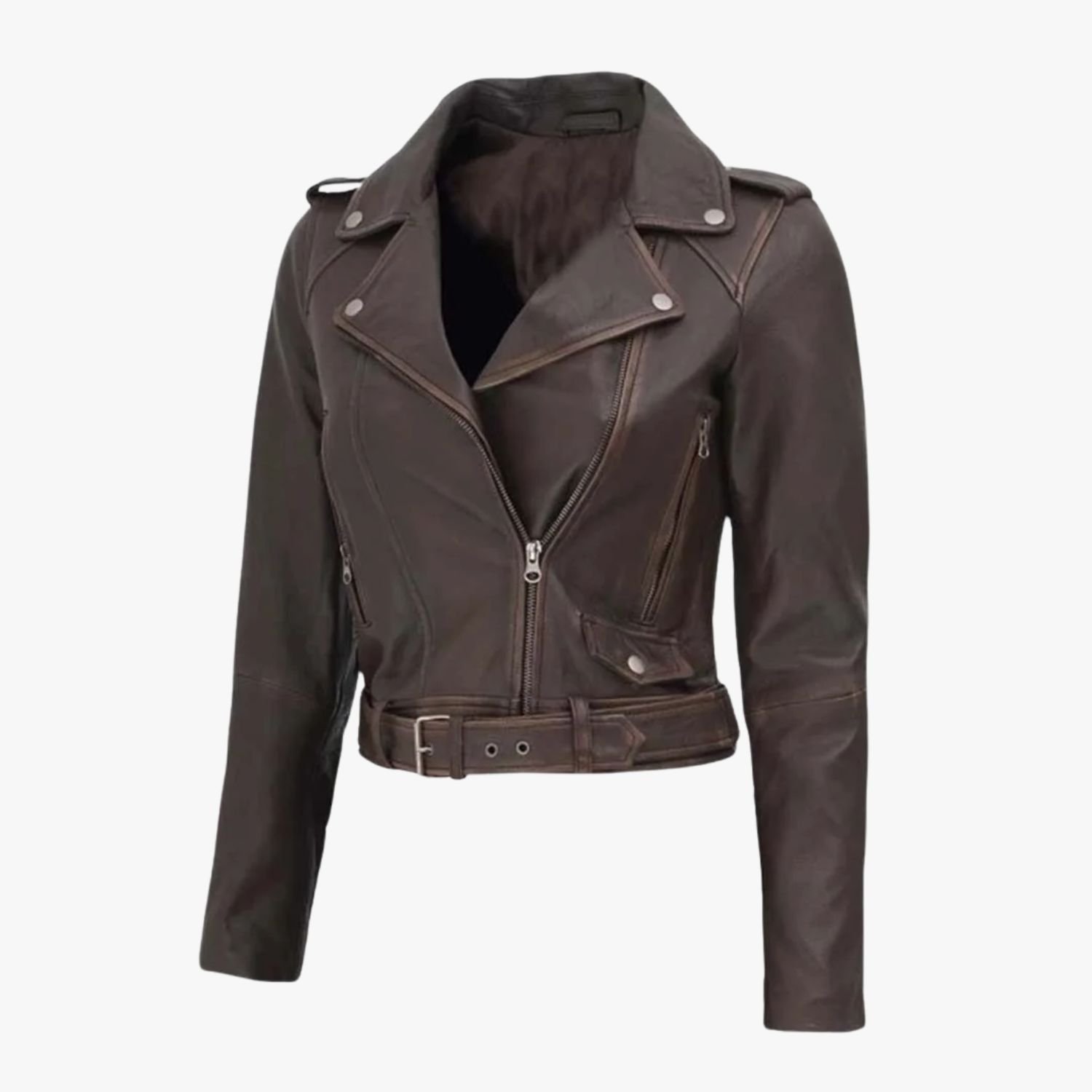 Women’s Dark Brown Distressed Cropped Leather Biker Jacket by Movie Jackets Hub