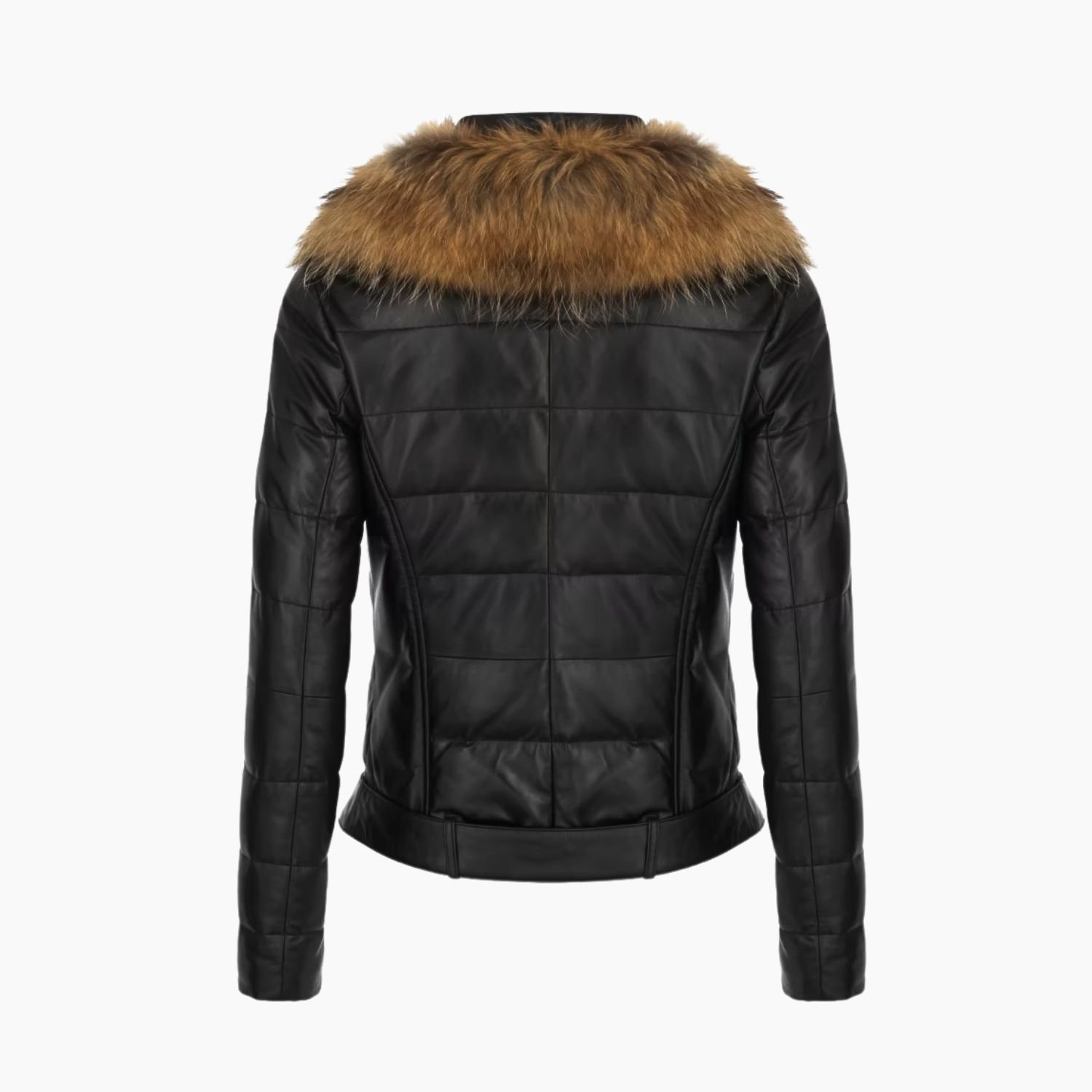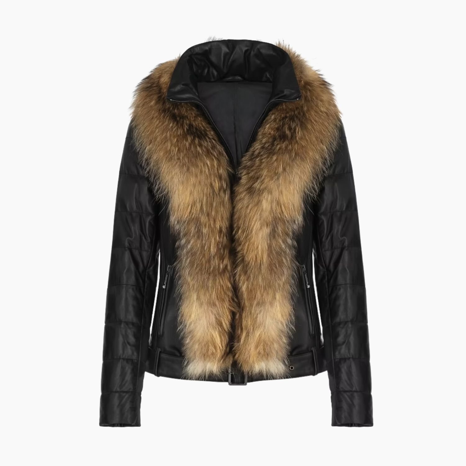Meticulously crafted from genuine sheepskin leather, the exterior offers a buttery-soft, wind-proof barrier that commands a premium presence. The interior is a revolution in insulation, packed with a 90% duck down and 10% duck feather filling, creating a lightweight, heat-trapping micro-climate that remains breathable. The design by Movie Jackets Hub is anchored by a natural raccoon fur-trimmed collar, adding a plush, organic frame to the face. A functional waist belt allows you to sculpt a sharp, feminine profile, while the front zipper closure and zippered pockets provide a secure, streamlined finish to this casual luxury staple.