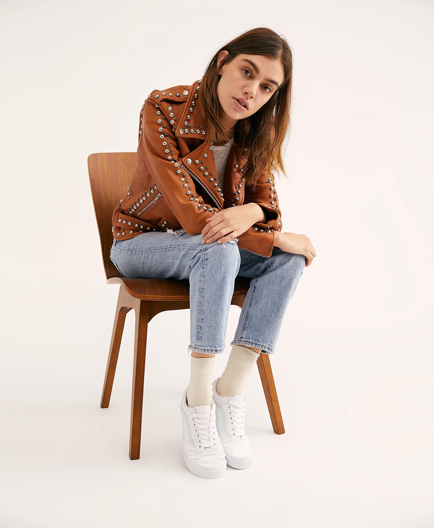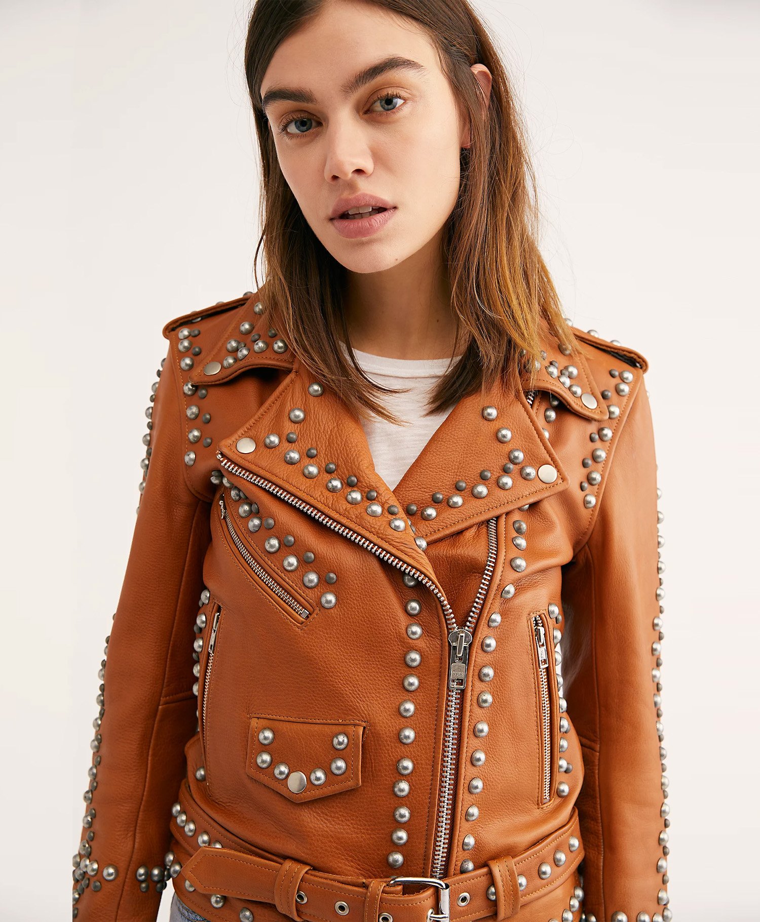 Step into the spotlight with a piece that defines rebellious elegance. The Womens Moto Biker Brown Studded Leather Jacket is more than just outerwear; it is a statement of confidence. Crafted from premium lambskin leather, this jacket by Movie Jackets Hub offers a buttery-soft texture that contours to your silhouette while maintaining the rugged durability expected of a classic biker staple. The rich tan hue provides a refreshing alternative to traditional black, offering a warm, earthy aesthetic that pairs effortlessly with vintage denim or sleek evening wear.
