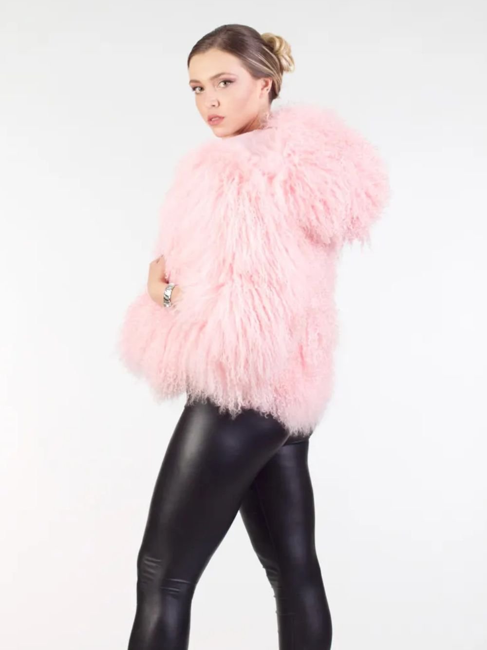 Womens Pink Mongolian Lamb Fur Soft Fluffy Coat With Hood For Winter Season