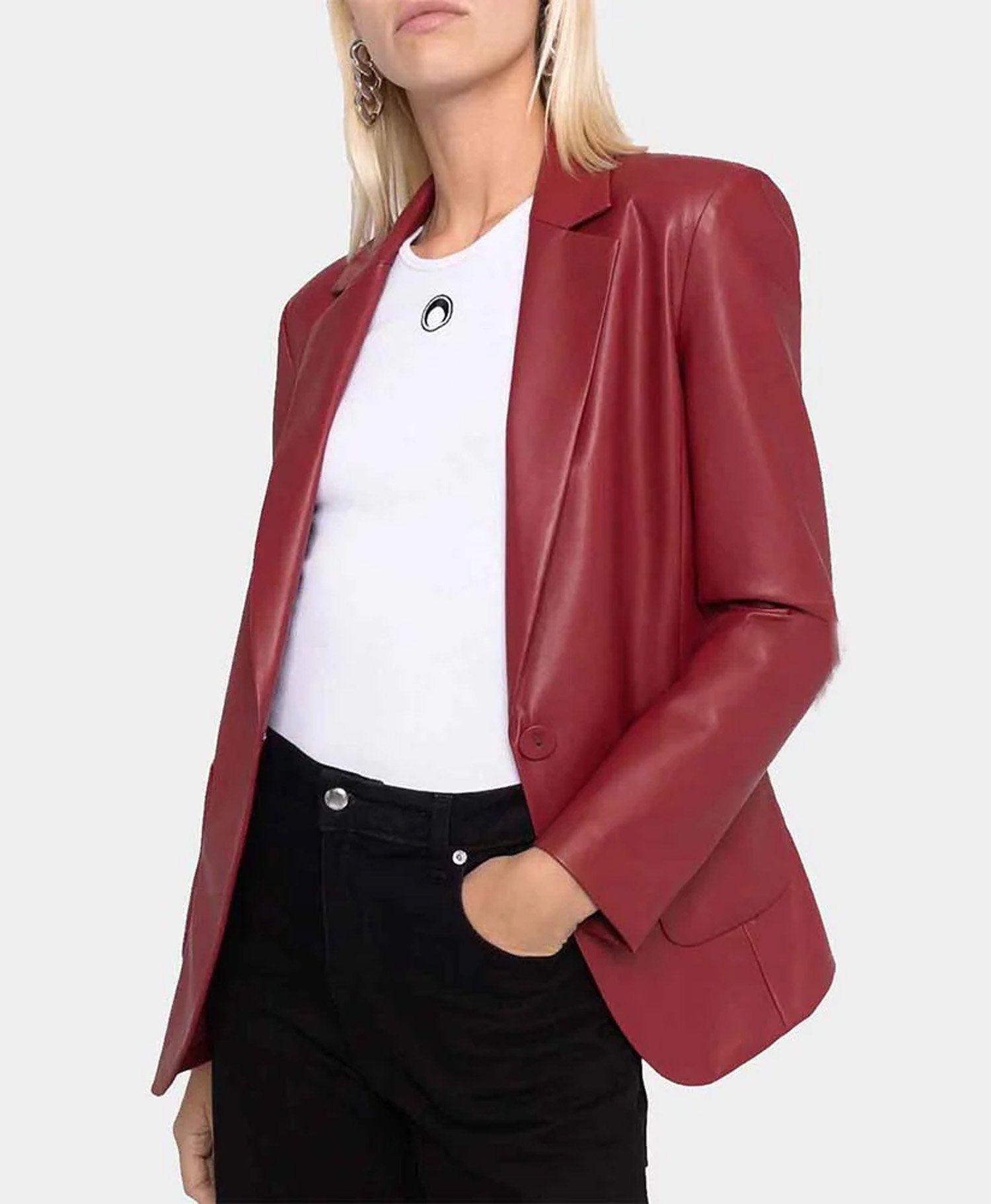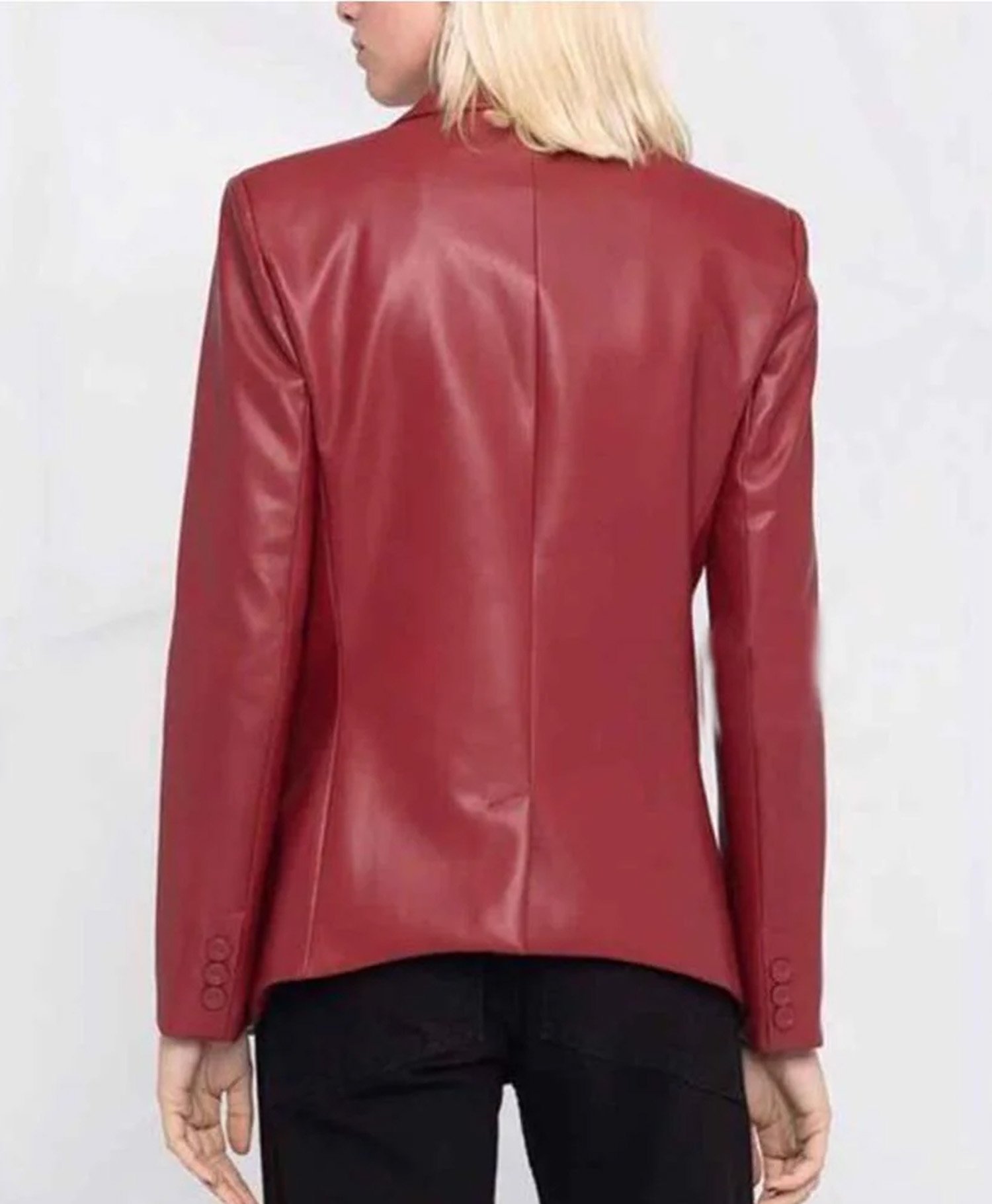 Step into confidence with the Women’s Red Slim Fit Leather Blazer a timeless statement piece designed to empower your wardrobe. Crafted in a striking crimson red, this blazer by Movie Jackets Hub adds an instant boost of energy and sophistication to any outfit. Whether you’re leading a meeting or heading out for a night in the city, this piece delivers modern glam with a fierce edge.