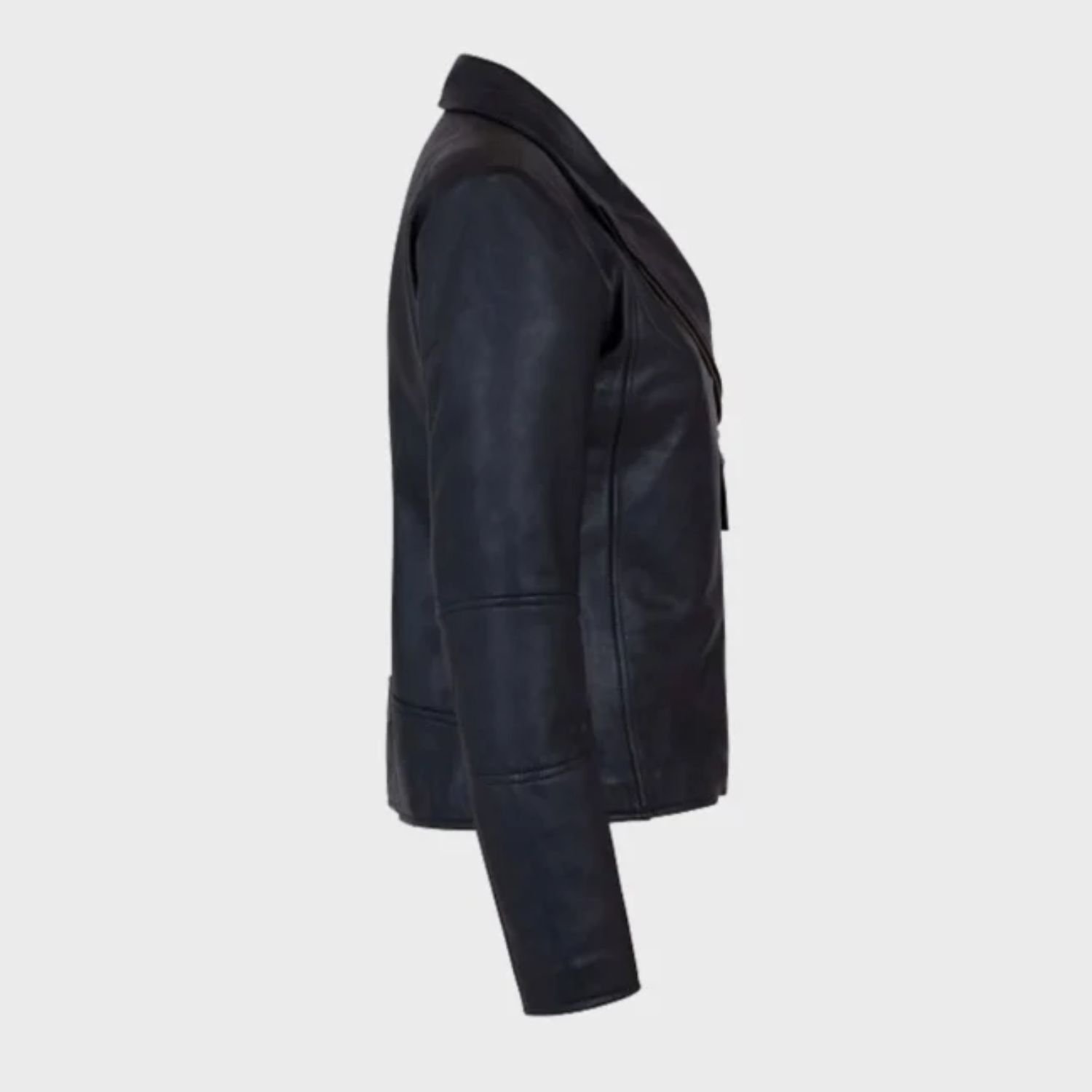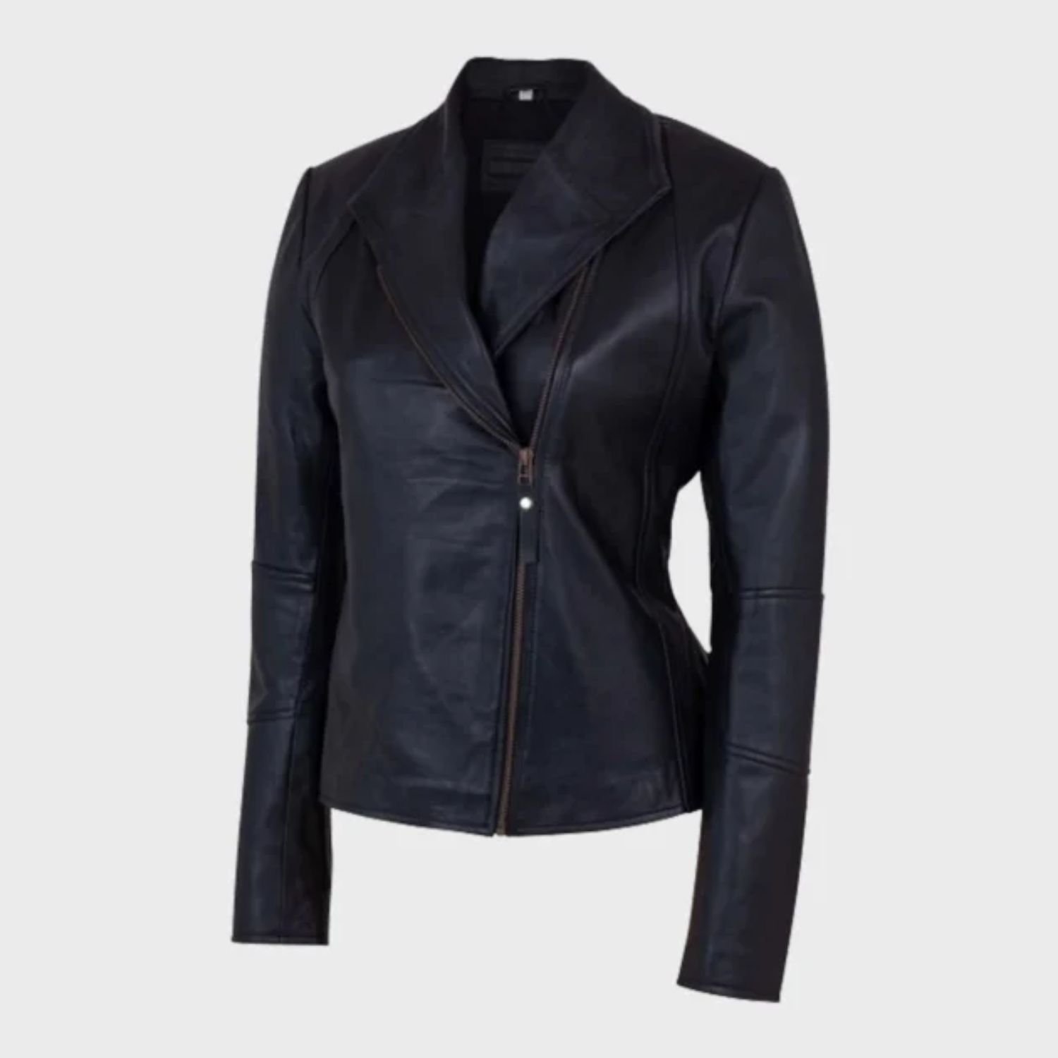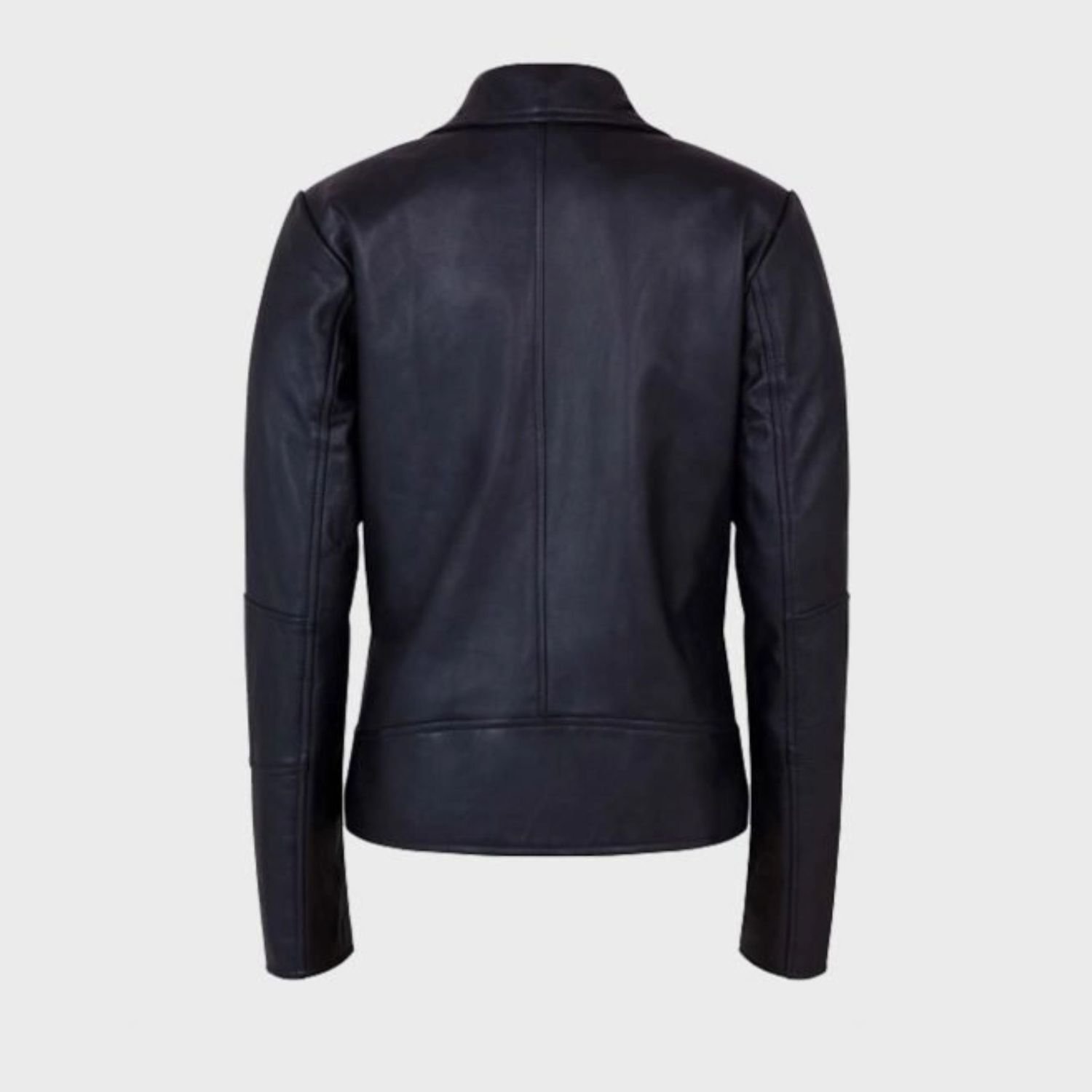 Women’s asymmetrical shawl collar black leather jacket has a front branded YKk zipper closure which gives off a beautiful look. Moreover, it has a lovely shawl collar that provides you a so unique look. The alluring shawl collar black leather jacket accommodates full-length sleeves and open hem cuffs. Furthermore, it has full-length sleeves and open hem cuffs which gives off a decent look. The lovely leather jacket is available in black color.