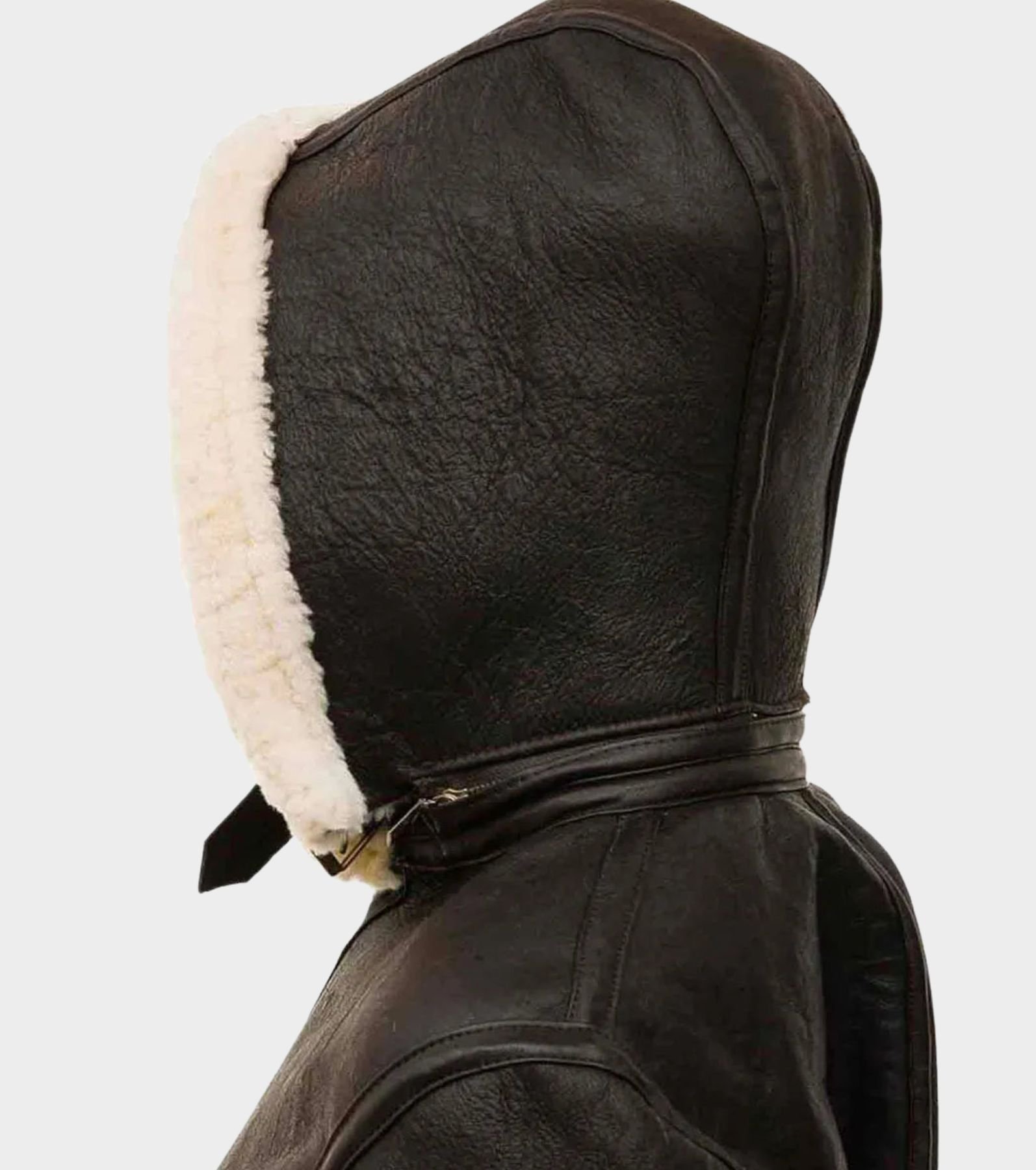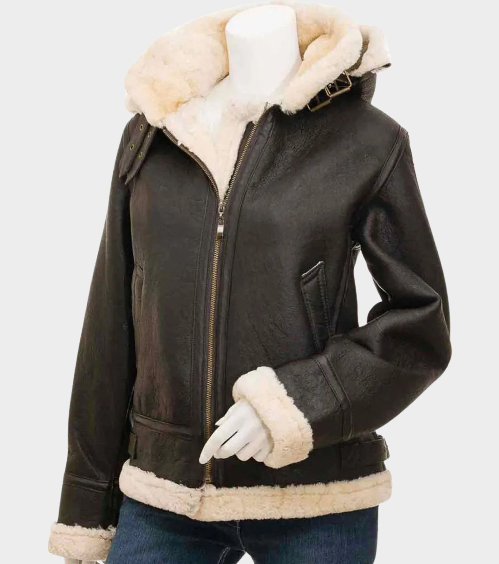 Womens Shearling Buckle Collar Brown Leather Jacket with Hood
