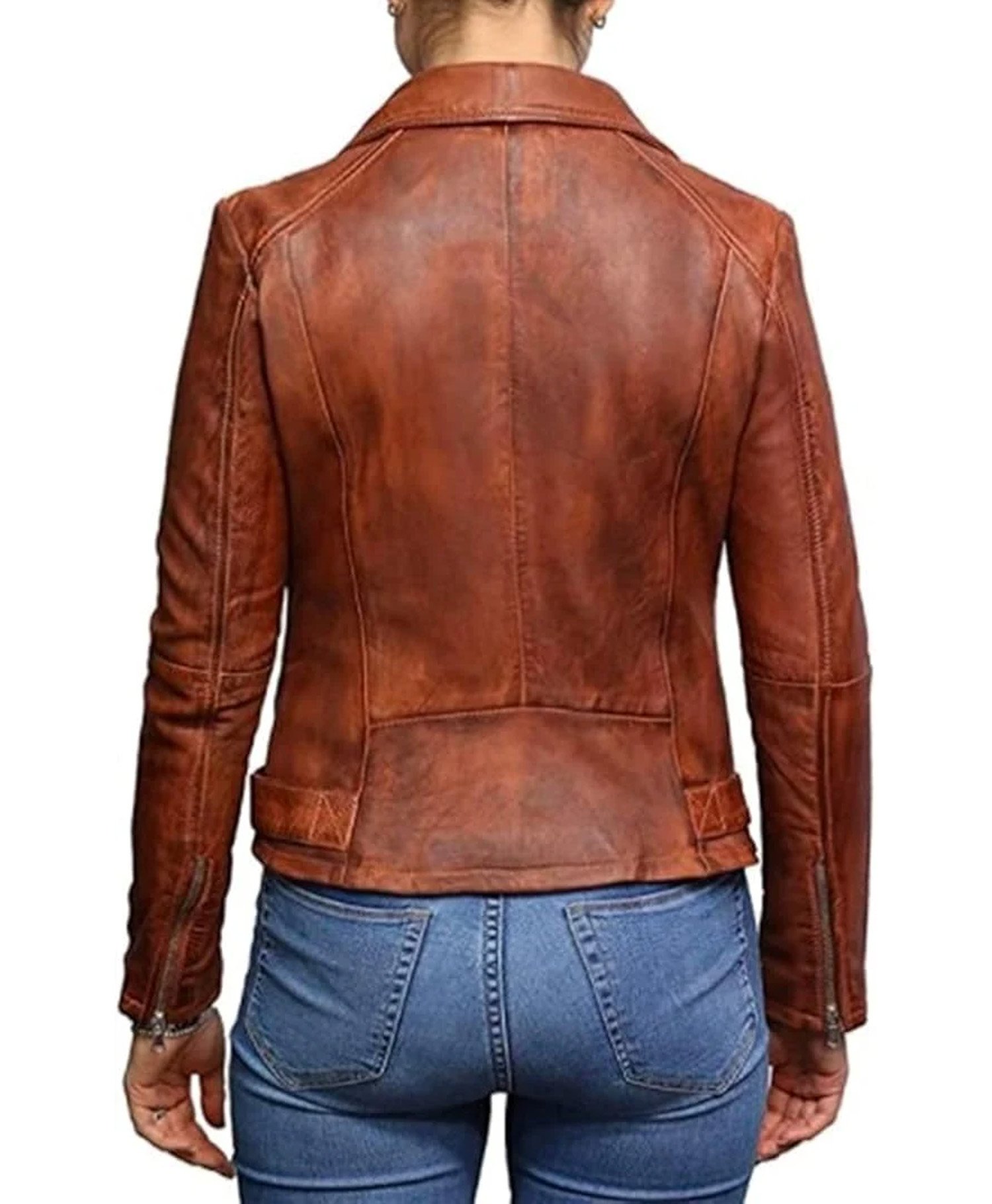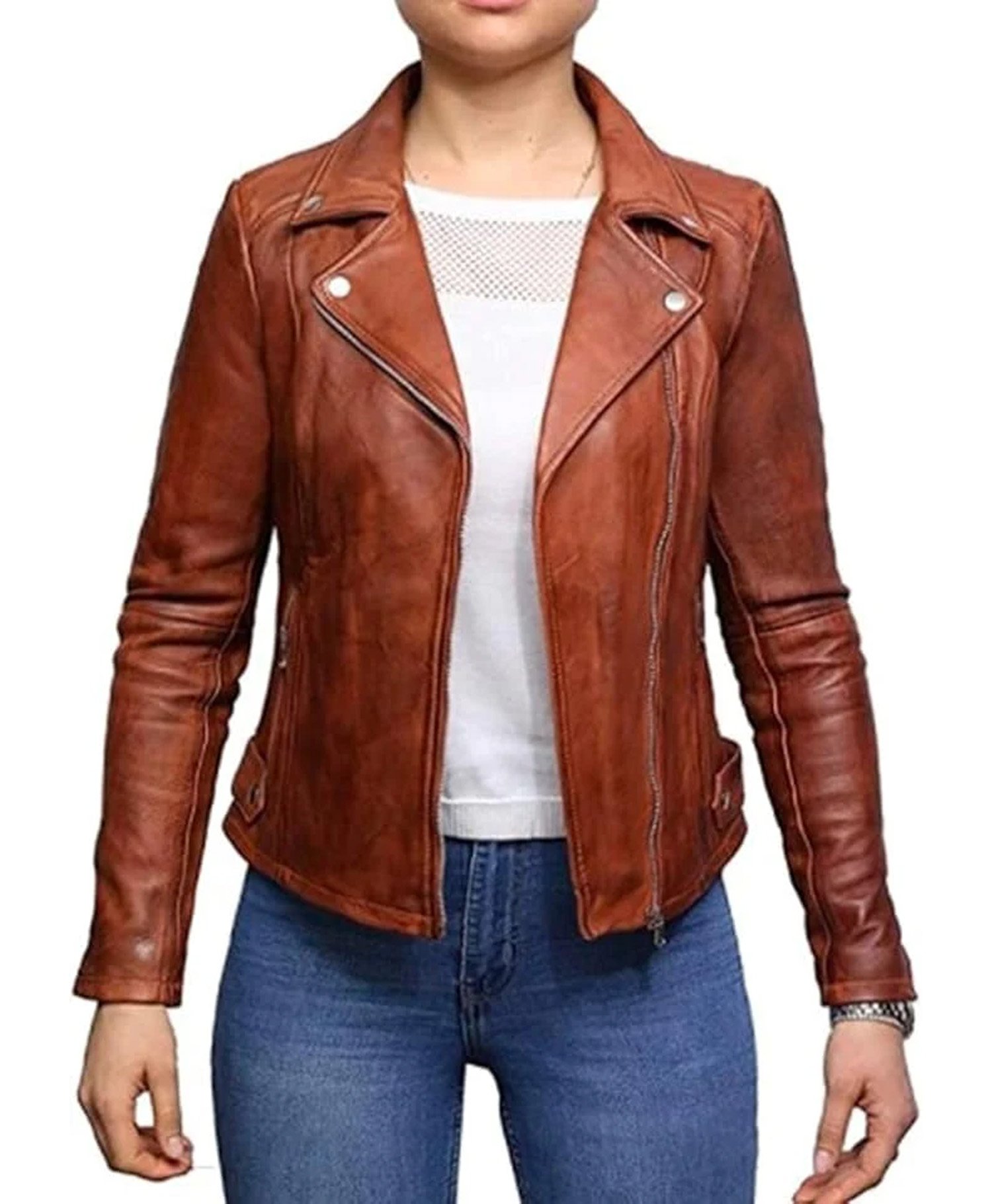 Womens Vintage Brown Cross Zip Slim Fit Genuine Real Leather Jacket
