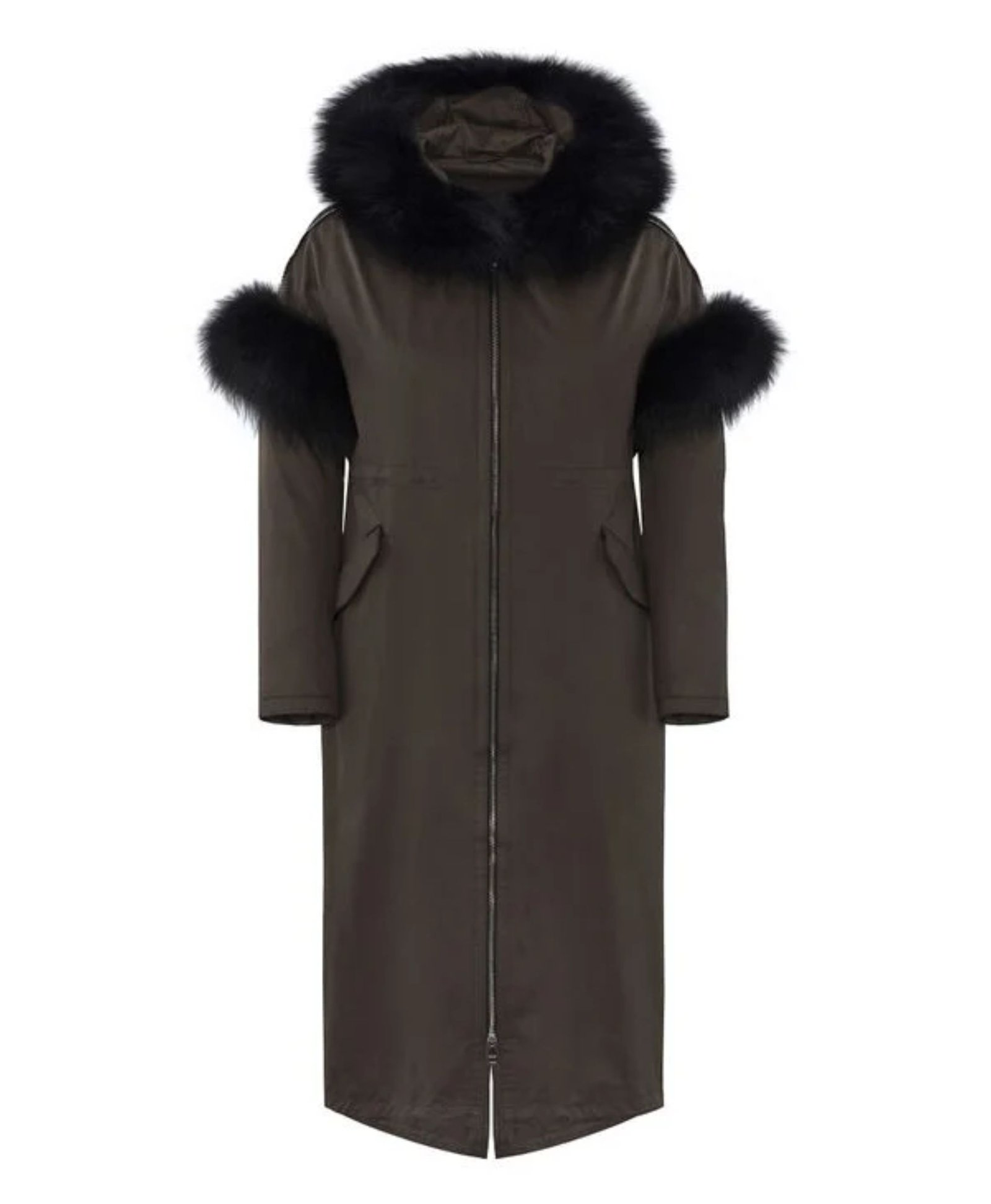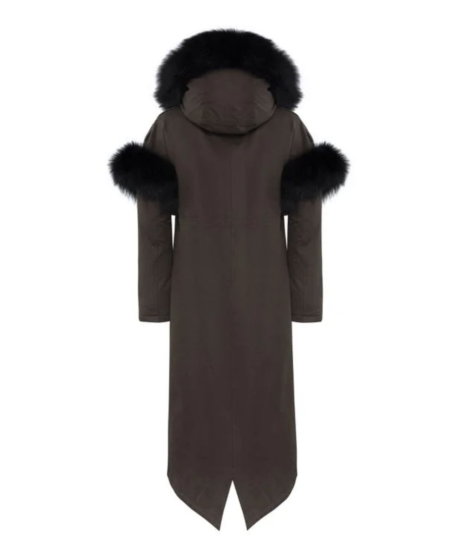 - Collar: Attached Hood with Faux Fur Trim