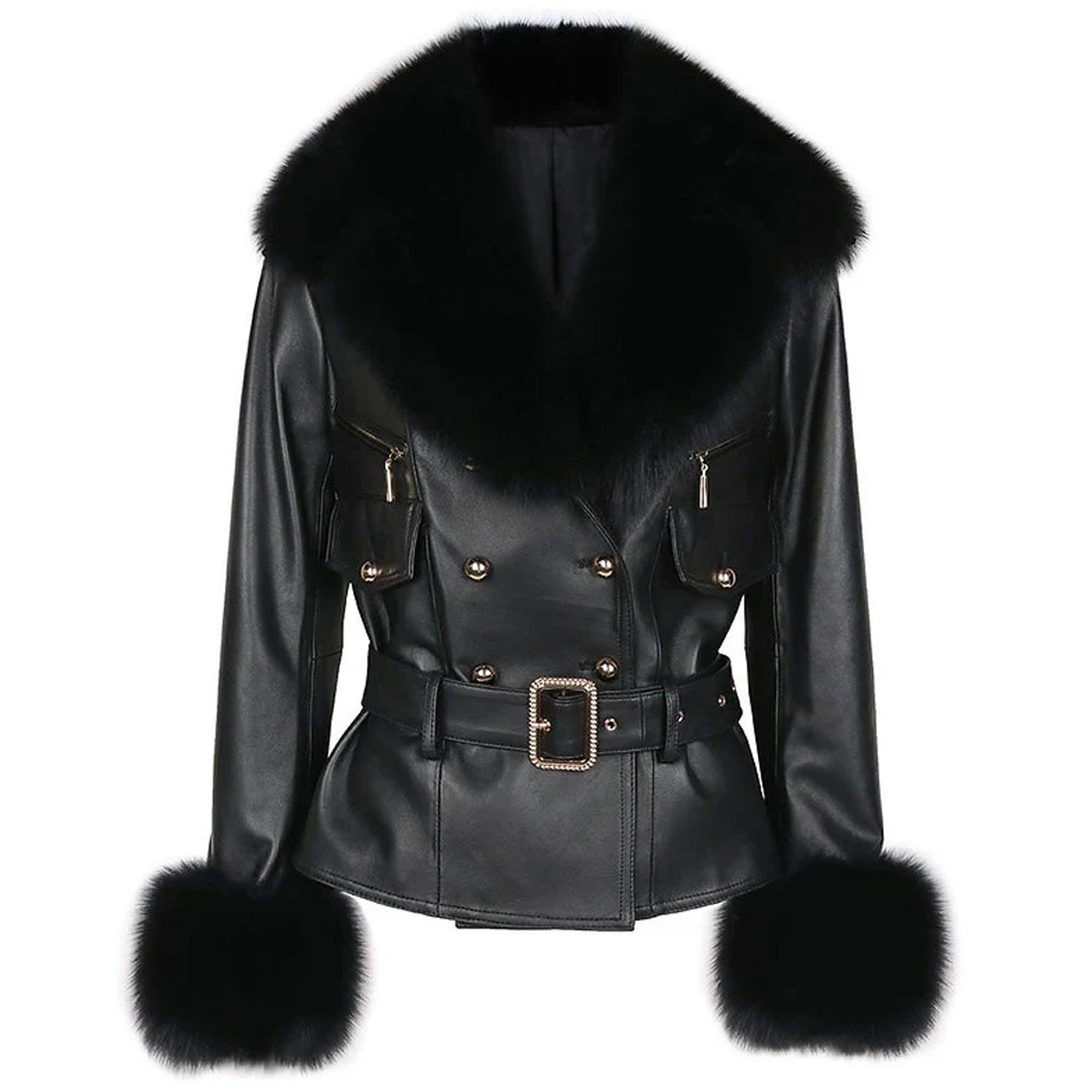 - Style: Luxury Double Breasted Leather Jacket With Fur Trim
