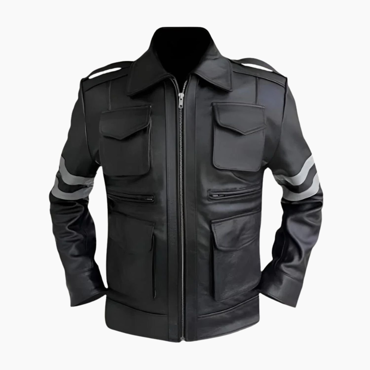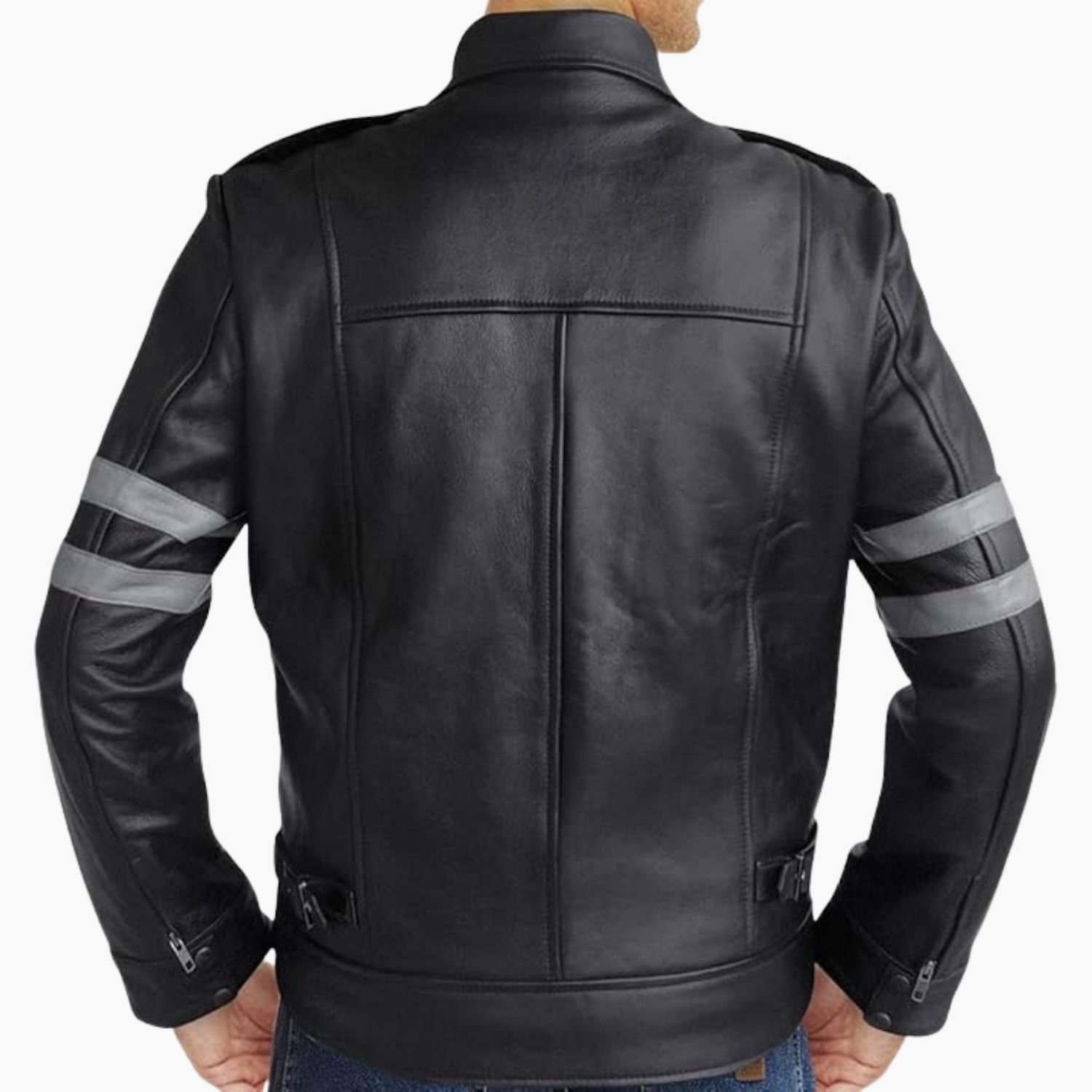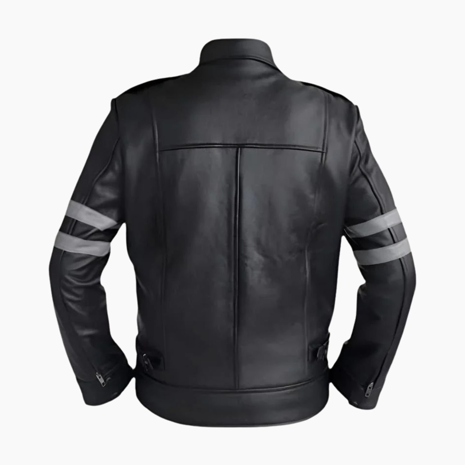 The Zombie Hunter Jacket is built for the “Modern Outlaw.” Crafted from 100% Real Leather, the exterior offers a heavy-duty, windproof shell that serves as a formidable barrier against the elements. The design is defined by its high-contrast Grey Strips on the Sleeves, providing a sharp, racing-inspired visual that breaks up the deep black leather and adds a high-octane edge to your profile.